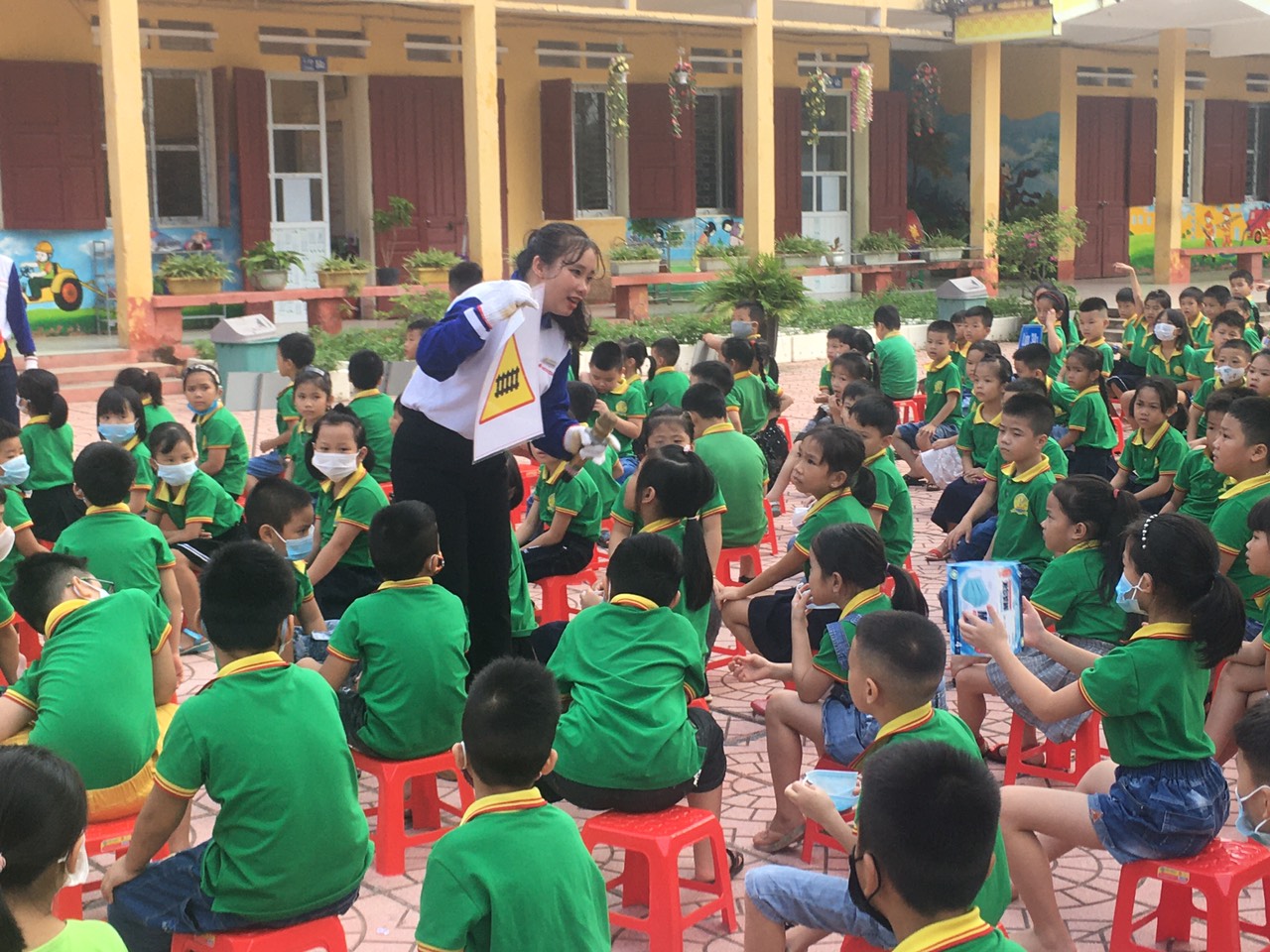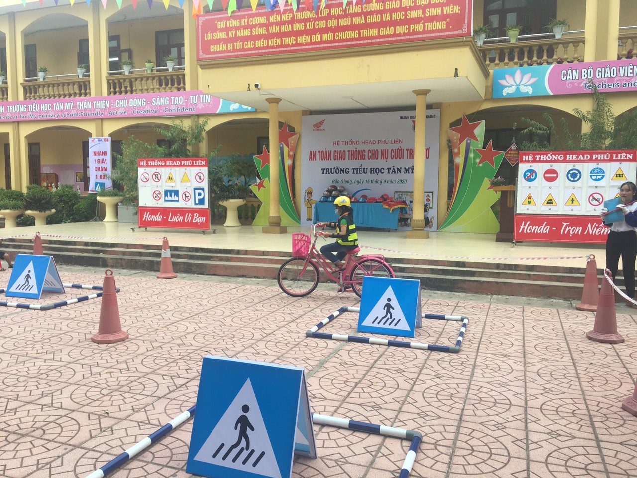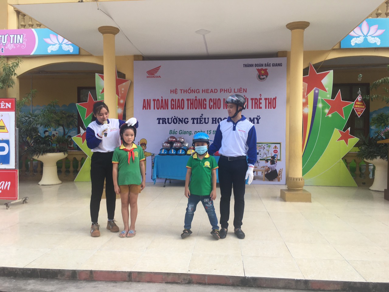 Tại đây, các em học sinh được hướng dẫn các kỹ năng cơ bản khi tham gia giao thông như: Đội mũ bảo hiểm đúng cách, ngồi sau xe máy, xe đạp an toàn . Ngoài ra các em còn được tham gia các trò chơi ghép biển báo giao thông, thử tài trí nhớ và câu hỏi tìm hiểu về an toàn giao thông, được thực hành đi xe đạp an toàn.