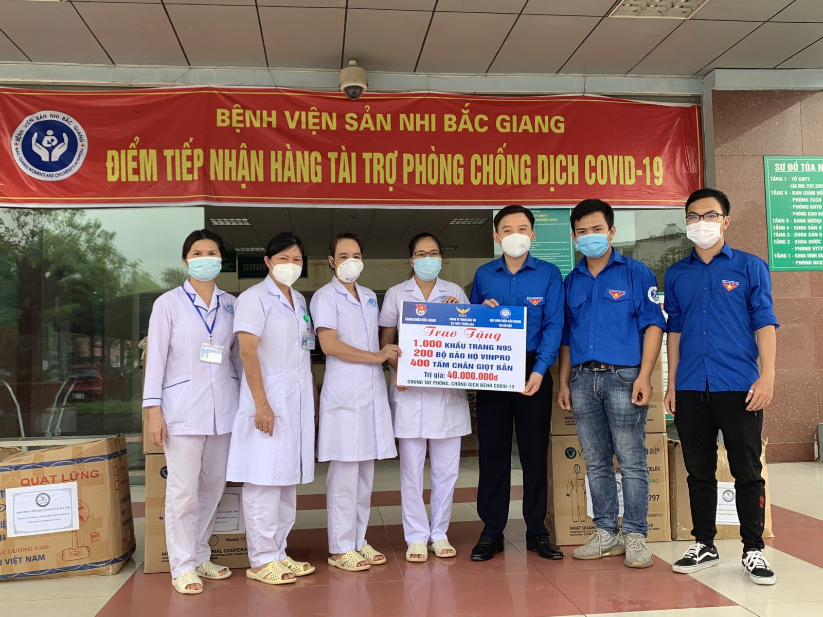 Theo đó, Đoàn trao ủng hộ Bệnh viện Sản Nhi Bắc Giang: 1.000 khẩu trang N95; 200 bộ bảo hộ Vinpro; 400 tấm chắn giọt bắn; trao tặng Trung tâm Y tế thành phố 55 thùng gồm cháo sen, nước chanh muối, nước khoáng, orezol, 100 hộp nước yến, 2000 găng tay lấy mẫu, 200 bộ phòng dịch chuyên dụng. Tổng trị giá 70 triệu đồng. Nguồn kinh phí xã hội hóa do các tổ chức ủng hộ như: Công ty TNHH đầu tư và phát triển AZa; Hội sinh viên Bắc Giang tại Hà Nội; Quận đoàn Hà Đông, Đoàn thanh niên khối cơ quan thành phố Hà Nội, Đoàn thanh niên các khu công nghiệp và chế xuất Hà Nội.