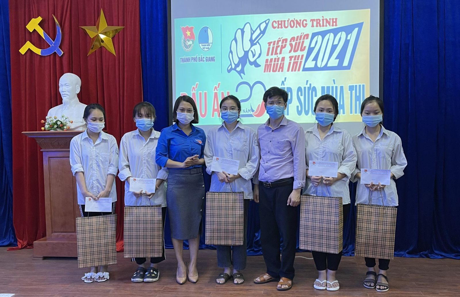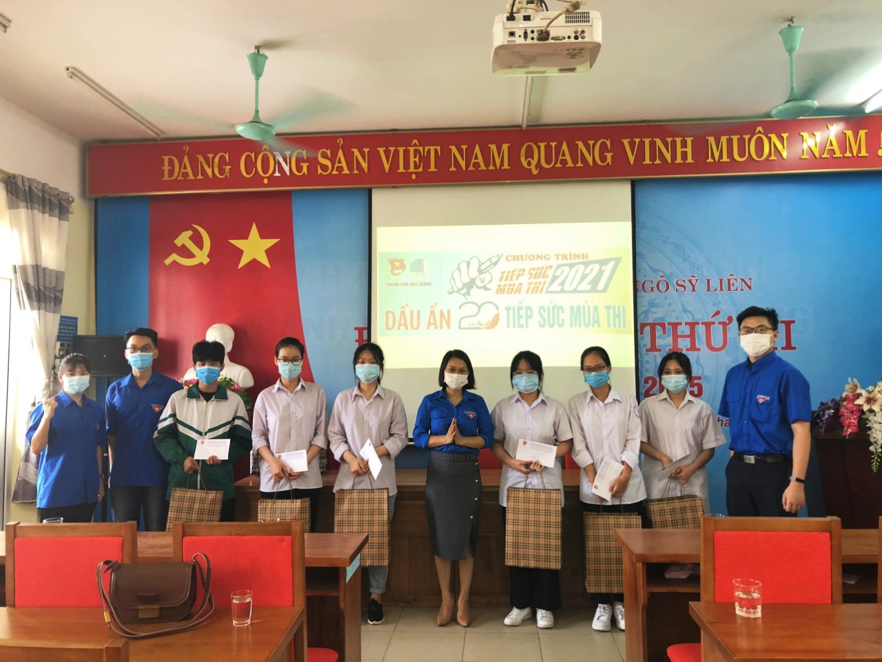 Nhân dịp này, các đồng chí đã trao 16 xuất quà cho các em học sinh có hoàn cảnh khó khăn của trường THPT Ngô Sĩ Liên và trường THPT Giáp Hải tham gia kỳ thi tốt nghiệp THPT năm 2021, trị giá 8 triệu đồng. Kinh phí được hỗ trợ từ nguồn xã hội hóa của Thành đoàn, Nhà văn hóa thiếu nhi tỉnh Bắc Giang, Chi đoàn Ban Quản lý dự án đầu tư xây dựng thành phố.