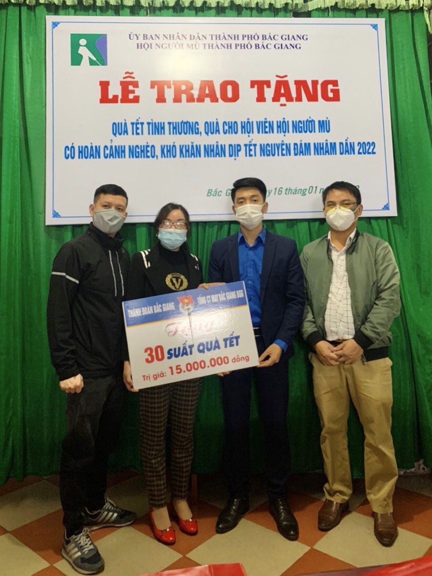 Tham dự chương trình có đồng chí Lương Văn Huy - Bí thư Thành đoàn; đại diện Hội người mù thành phố; đại diện Tổng công ty May Bắc Giang BGG. Tại chương trình, Thành đoàn Bắc Giang phối hợp với Tổng công ty May Bắc Giang BGG tặng 30 suất quà tết cho các hội viên Hội người mù thành phố trị giá 15 triệu đồng.