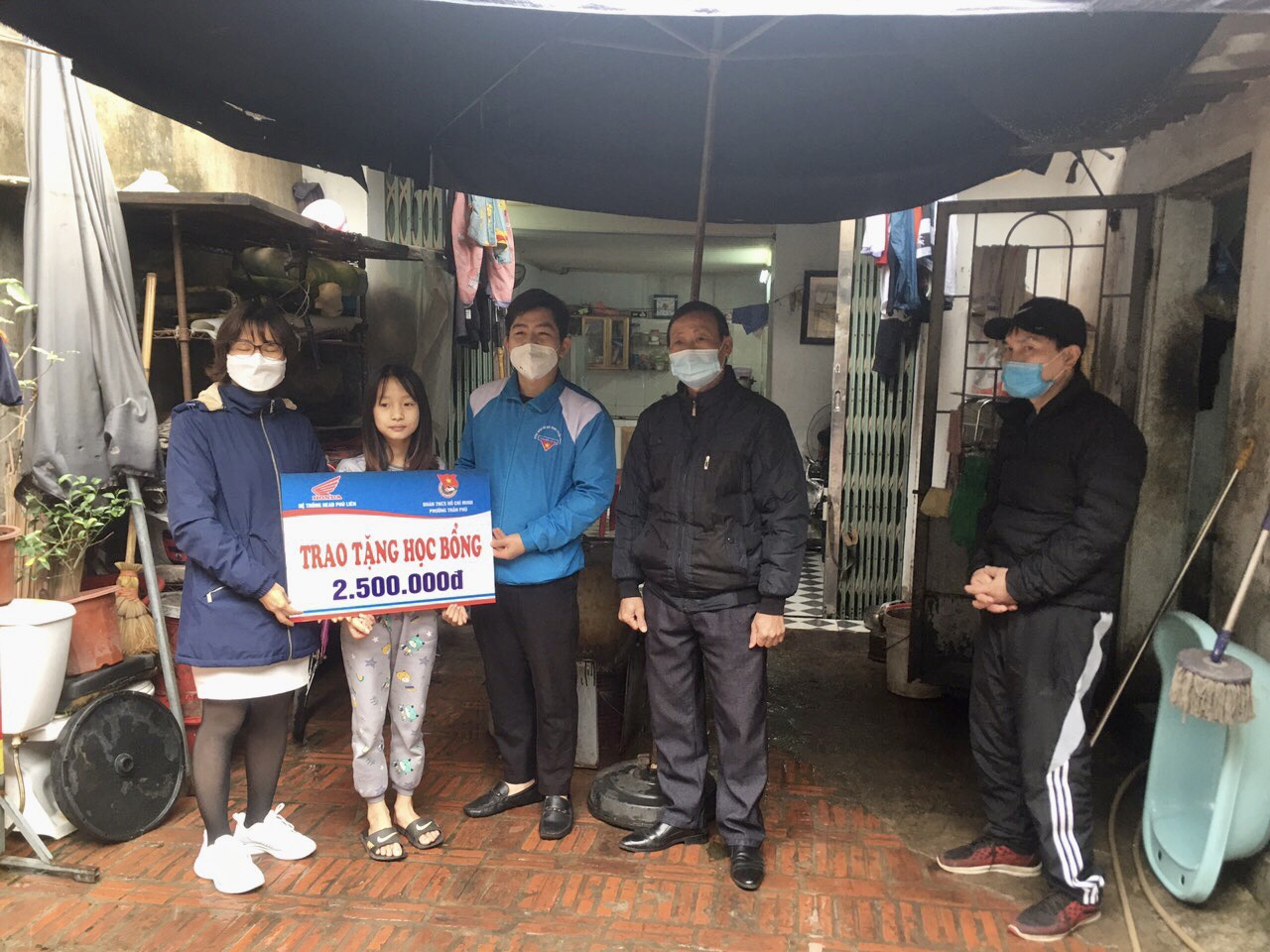 Trong buổi sáng Đoàn đã trao tặng 02 suất học bổng với trị giá mỗi suất 2.500.000đ/suất cho 02 em: Nguyễn Hạ Vy, học sinh lớp 4 trường Tiể học Trần Phú và em Phạm Duy Quang, học sinh lớp 4 trường Tiểu học Trần Phú, cả 02 em đều là học sinh có hoàn cảnh khó khăn và có thành tích tốt trong học tập nhiều năm liền.