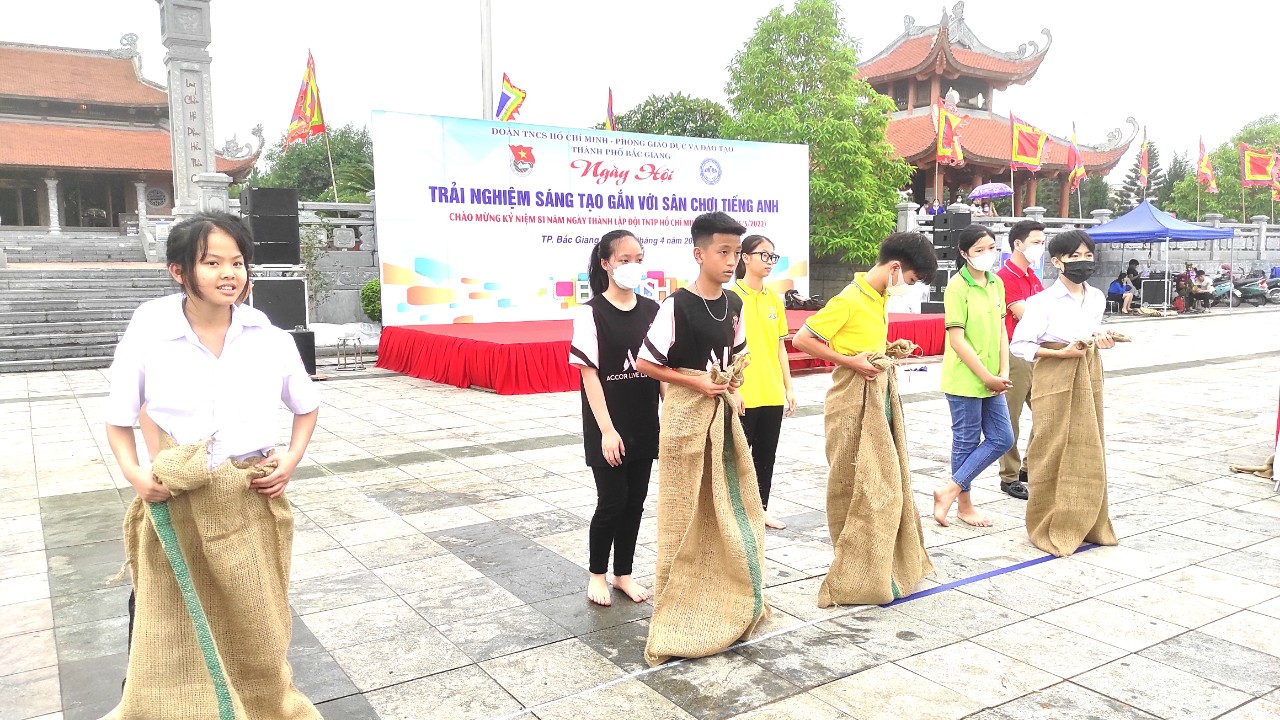 Diễn ra đồng thời cùng “Sân chơi tiếng Anh” là các hoạt động “Trải nghiệm sáng tạo”. Trên sân khuôn viên Khu di tích lịch sử Chiến thắng Xương Giang, các em học sinh đã được tham gia giao lưu với giáo viên tiếng Anh người nước ngoài, trải nghiệm nghề truyền thống với việc tự tay nướng những chiếc bánh đa đầy thú vị, đặc biệt hơn nữa, thu hút được số lượng lớn đội viên tham dự nhất đó là những trò chơi dân gian như Kéo co, nhảy bao bố. Sau thời gian thi đấu khẩn trương, nghiêm túc, Ban tổ chức đã tìm ra được đội thi giành chiến thắng các trò chơi dân gian, theo đó, trường THCS Dĩnh Kế đã xuất sắc giành giải Nhất cả 2 phần thi Kéo co và Nhảy Bao bố.