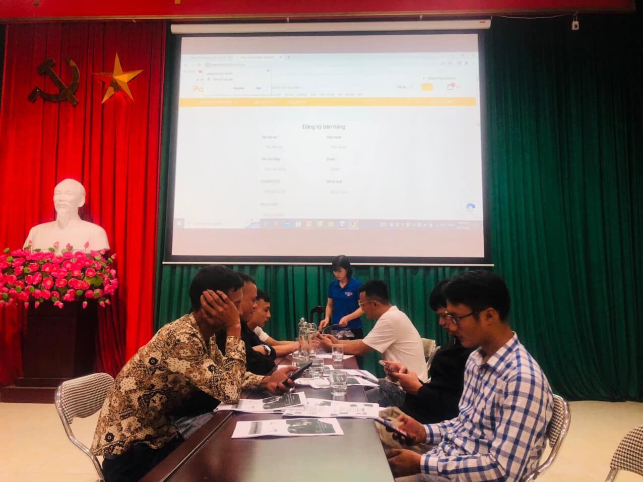 Đồng chí Vũ Thị Lan- Bí thư Đoàn xã, Chủ tịch Hội LHTN xã hướng dẫn thành viên câu lạc bộ đăng sản phẩn lên sàn thương mại điện tử.