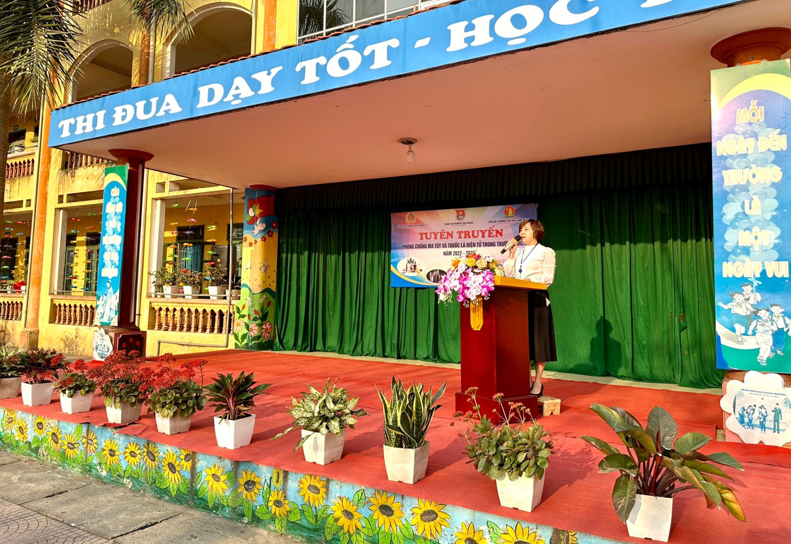 Cô Nguyễn Thị Kim Phúc GV Tổng phụ trách Đội lên nói lời cảm ơn báo cáo viên đã giúp các em học sinh nâng cao kiến thức, hiểu biết về tác hại, hệ lụy của ma túy và thuốc lá điện tử.
