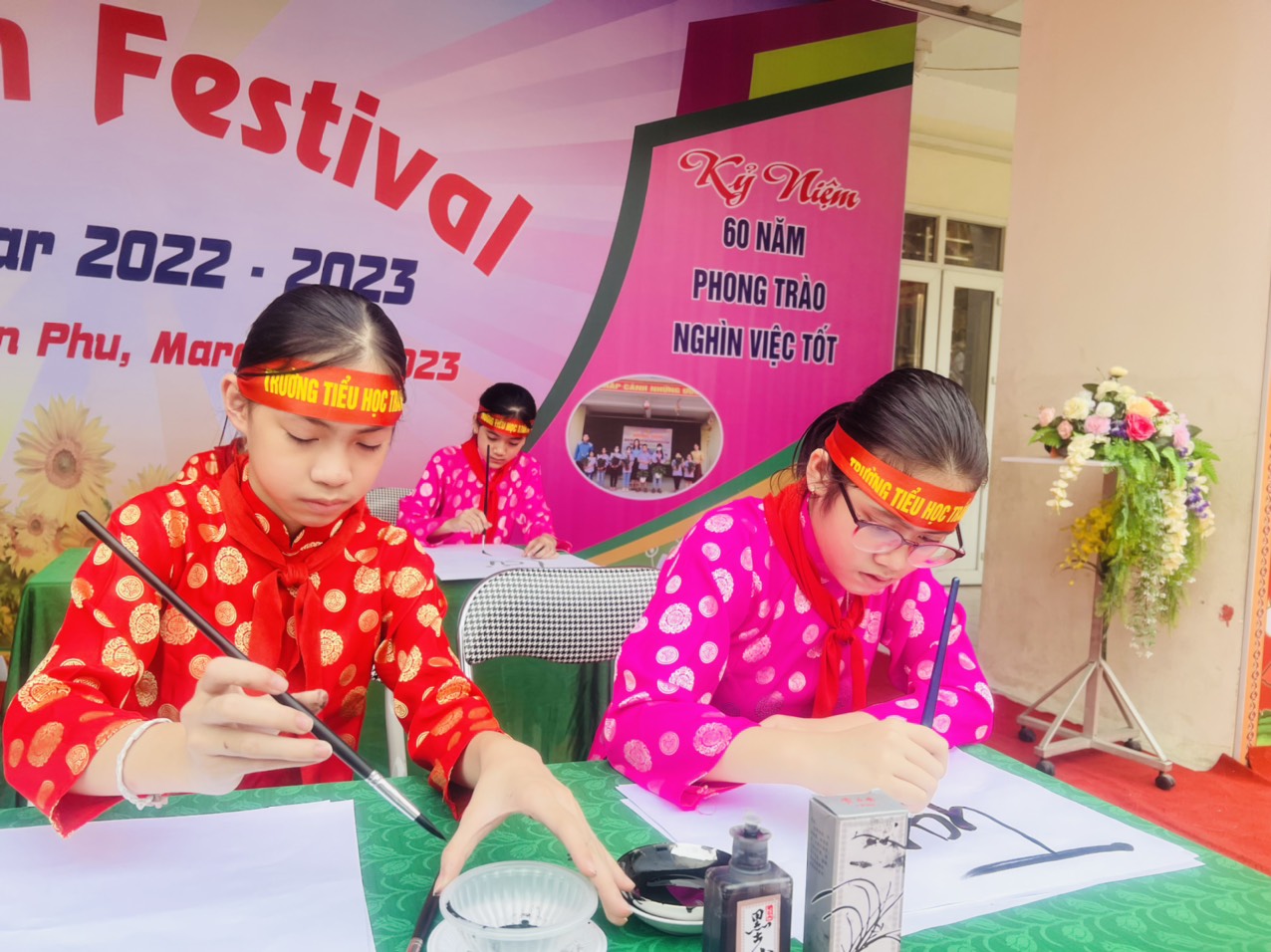 Ngoài ra các em học sinh khối 5 còn được trải nghiệm hoạt động viết chữ thư pháp. Các em đã thể hiện được sự khéo léo của mình trong các tác phẩm chữ thư pháp.