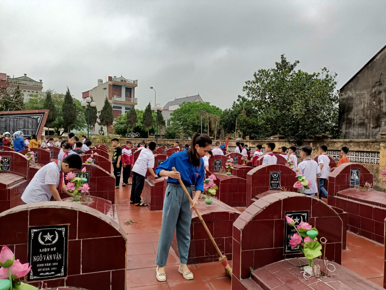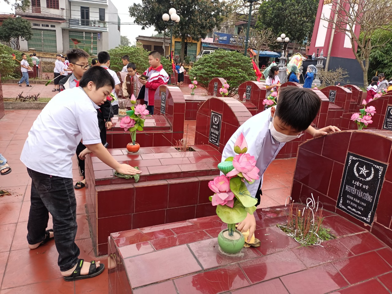 Cùng với việc thực hiện tốt công tác chăm sóc thương binh, gia đình Liệt sĩ, người có công với cách mạng, Liên đội trường Tiểu học Đa Mai, chi đoàn nhà trường thường xuyên quan tâm chăm sóc, dọn dẹp vệ sinh nghĩa trang Liệt sĩ, thể hiện lòng tri ân của tuổi trẻ ngày nay đối với thế hệ cha anh đã hy sinh vì sự nghiệp xây dựng và bảo vệ Tổ quốc. Bằng tình cảm thành kính, các thầy cô đoàn viên Chi đoàn nhà trường và các em học sinh đã dâng hương tưởng nhớ các anh hùng Liệt sỹ. Sau nghi lễ dâng hương trang trọng, các thầy cô và các em học sinh tiến hành nhổ cỏ, quét dọn, chăm sóc từng phần mộ cho hơn hai trăm ngôi mộ trong khuôn viên của nghĩa trang.