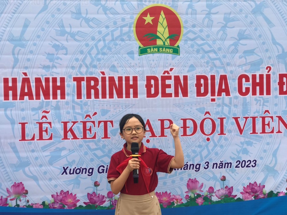 Lễ kết nạp được diễn ra ngắn gọn, trang nghiêm, với sự phấn khởi xen lẫn tự hào của các em học sinh khối 3. Sau phần nghi lễ chào cờ, giới thiệu đại biểu, Em Bùi Ngọc Diệp lớp 3A5 thay mặt các em học sinh được kết nạp lên đọc đơn xin vào đội.
