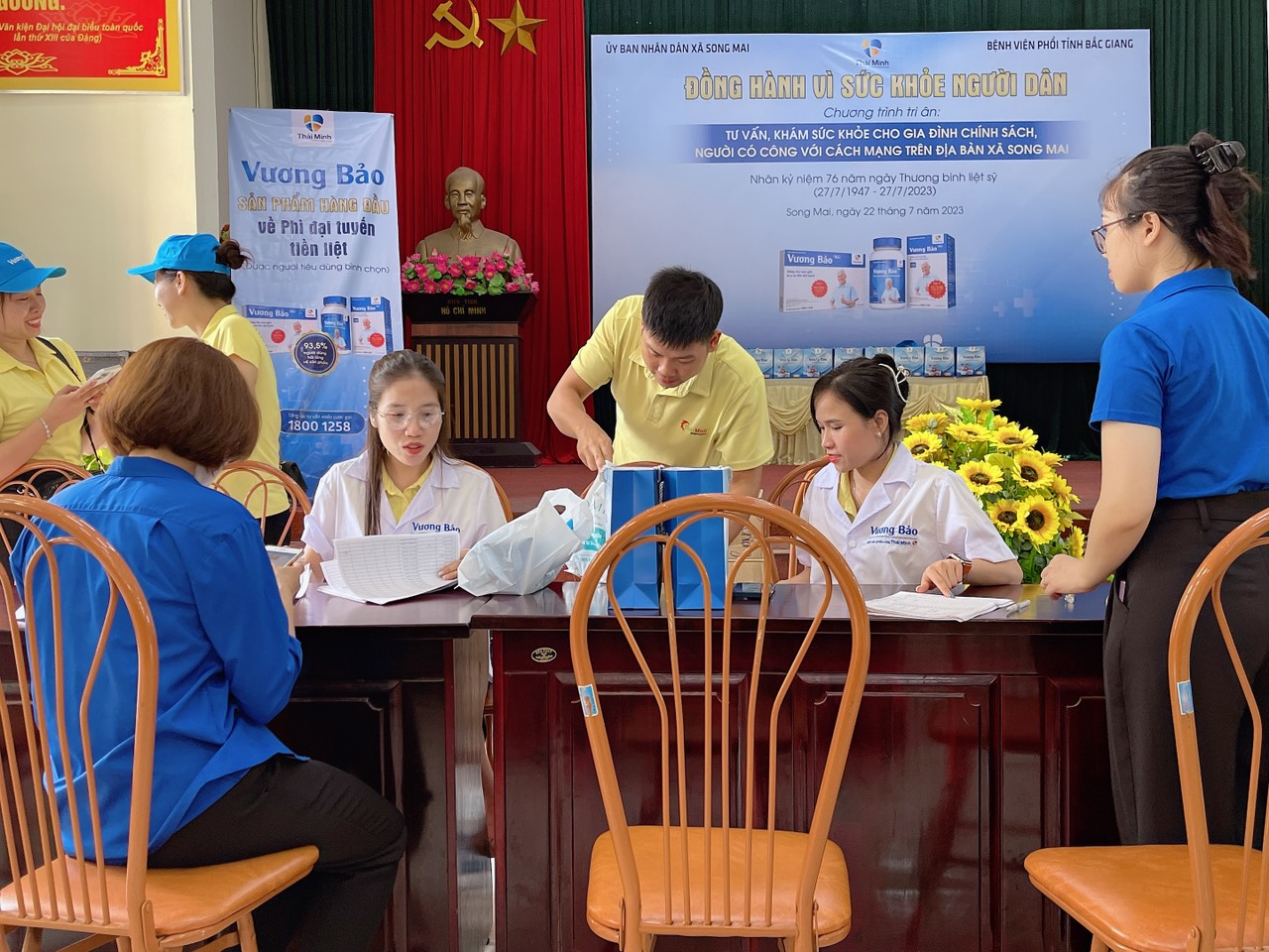 Được sự nhất trí cùa Thường trực Đảng uỷ, sáng ngày 22/7/2023, Đoàn thanh niên xã phối hợp UBND xã Song Mai, Bệnh viện Phổi tỉnh Bắc Giang, Công ty Dược phẩm Thái Minh, Trạm y tế xã Song Mai tổ chức tư vấn, khám sức khoẻ miễn phí cho 193 gia đình sách, có công với cách mạng trên địa bàn. Cấp phát thuốc miễn phí trị giá 40 triệu đồng.