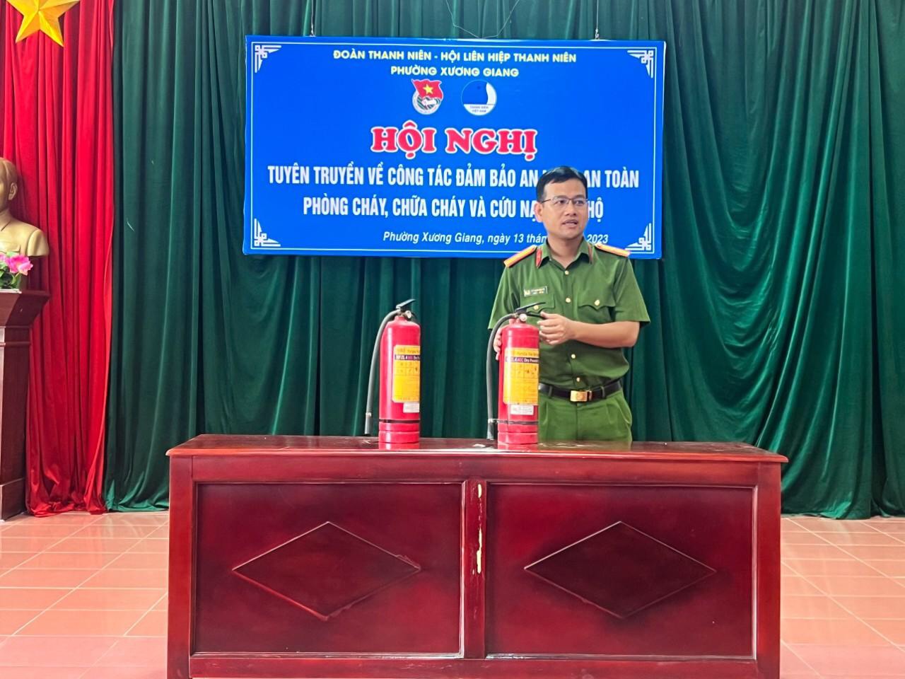 Tại Hội nghị, các bạn đoàn viên, thanh niên được nghe đồng chí Thiếu tá Lê Thanh Quyết- Báo cáo viên- Đội CS PCCC&CNCH, Công an thành phố Bắc Giang thông tin về tình hình cháy, nổ trên địa bàn toàn quốc nói chung và thành phố Bắc Giang nói riêng trong thời gian qua; đồng chí đã tuyên truyền, phổ biến các quy định pháp luật về PCCC; các nguyên nhân gây ra cháy, nổ; trách nhiệm của đoàn viên, thanh niên đối với công tác PCCC; các kiến thức cơ bản về PCCC, biện pháp đảm bảo an toàn khi sử dụng các thiết bị điện, đun nấu, sử dụng bếp gas..; hướng dẫn sử dụng phương tiện chữa cháy tại chỗ, những kỹ năng, cách xử lý tình huống khi xảy ra sự cố cháy, nổ, kỹ năng thoát hiểm, biện pháp chữa cháy và cứu nạn.