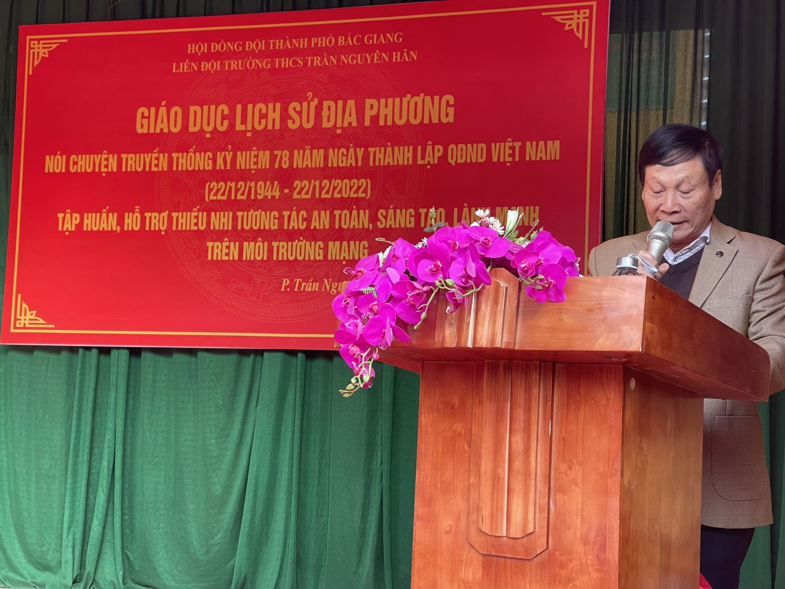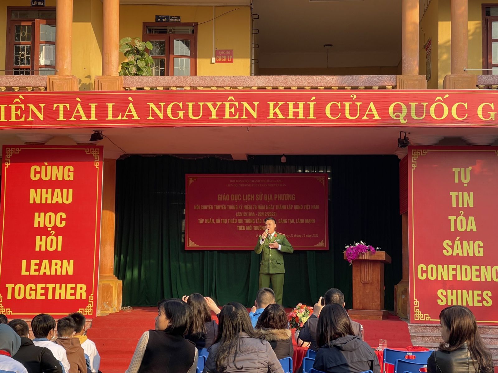 Trước đó, các bạn học sinh được nghe bác Trần Văn Hoành Nguyên cán bộ lãnh đạo sở Thông tin truyền thông chia sẻ truyền thống quân đội nhân dân Việt Nam, truyền thống lịch sử địa phương thầy và trò nhà trường như được sống lại với những trang sử vẻ vang, hào hùng của Quân đội nhân dân Việt Nam trên suốt chặng đường 78 năm.