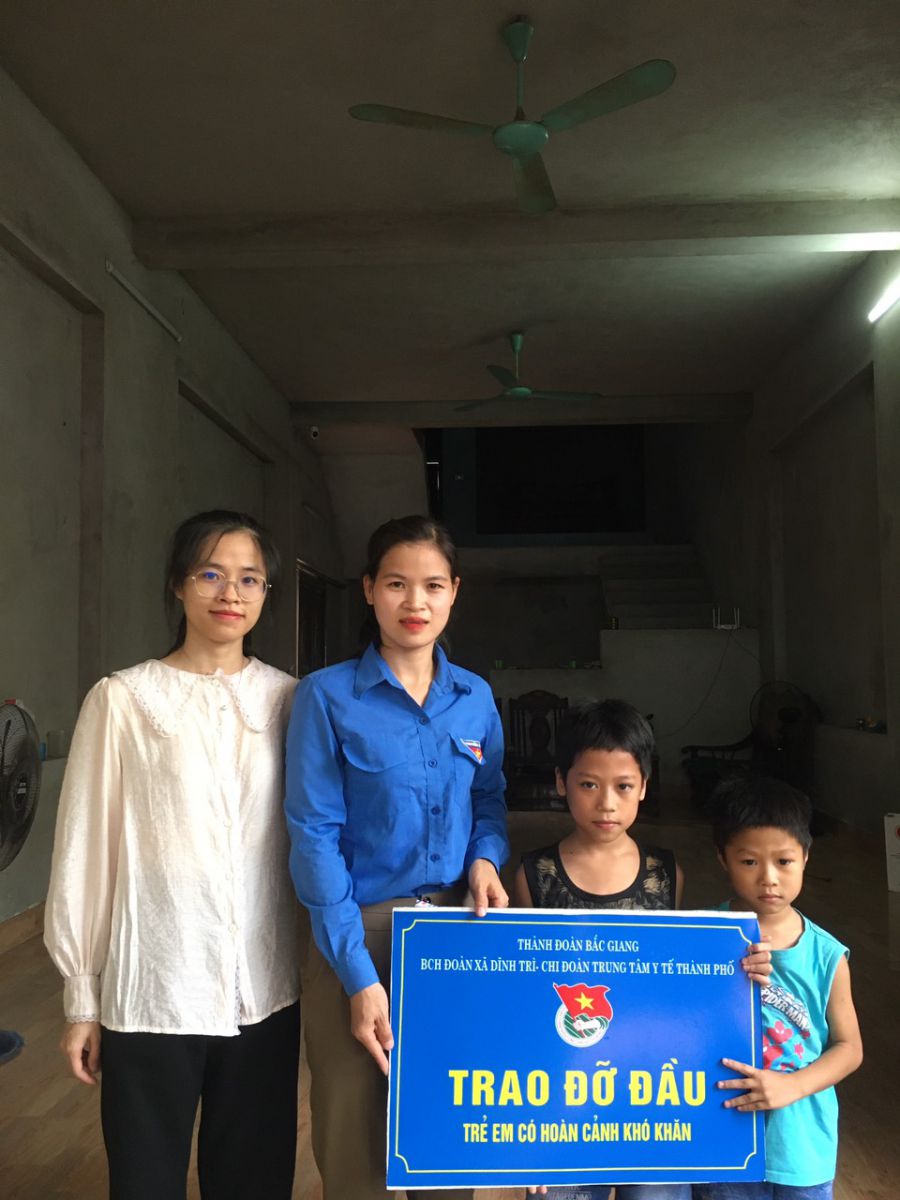 Theo đó Đoàn thanh niên xã Dĩnh Trì đã phối hợp với Chi đoàn Trung tâm y tế thành phố trao đỡ đầu cho cháu Nguyễn Đình Hoàng sinh năm 2014 , hiện đang cư trú tại thôn Bãi Ổi, xã Dĩnh Trì. Thời gian đỡ đầu trong 10 tháng với số tiền 200.000đ/tháng. Cháu Nguyễn Đình Hoàng, sinh năm 2015, hiện sắp bước vào lớp 3 Trường Tiểu học Dĩnh Trì. Hoàng mồ côi mẹ, hiện đang ở cùng bố và em trai 6 tuổi. Hoàn cảnh gia đình rất khó khăn, công việc của bố lại bấp bênh.