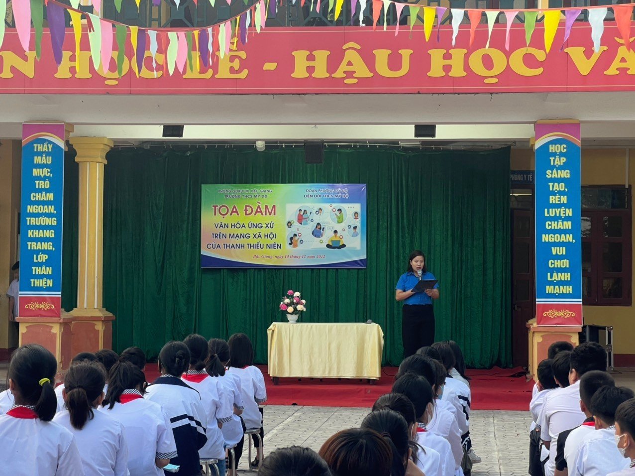 Tham dự buổi tọa đàm có chị Ngô Thị Phương Anh, bí thư Đoàn - Chủ tịch hội đồng đội phường Mỹ Độ, Cô Hà Vân Toàn Chủ tịch công đoàn, giáo viên trường THCS Mỹ Độ.Tại buổi tọa đàm, các khách mời đã có những chia sẻ thú vị, ý nghĩa, thiết thực. Vấn đề được đặt ra một cách cởi mở, mang tính thời sự, với những câu chuyện, tình huống, nhân vật gần gũi, chính vì vậy các em học sinh đã hào hứng đón nhận, trình bày suy nghĩ, quan điểm cá nhân. Qua đây, thầy cô thêm hiểu các em hơn, giúp các em tự phân biệt đúng sai, việc nên làm và không nên làm, phân tích được hệ lụy nghiêm trọng của việc sử dụng mạng xã hội sai mục đích. Từ đó, các thầy cô đưa ra những định hướng, lời khuyên cho các em để biết cách ứng xử văn minh và an toàn trên mạng xã hội.