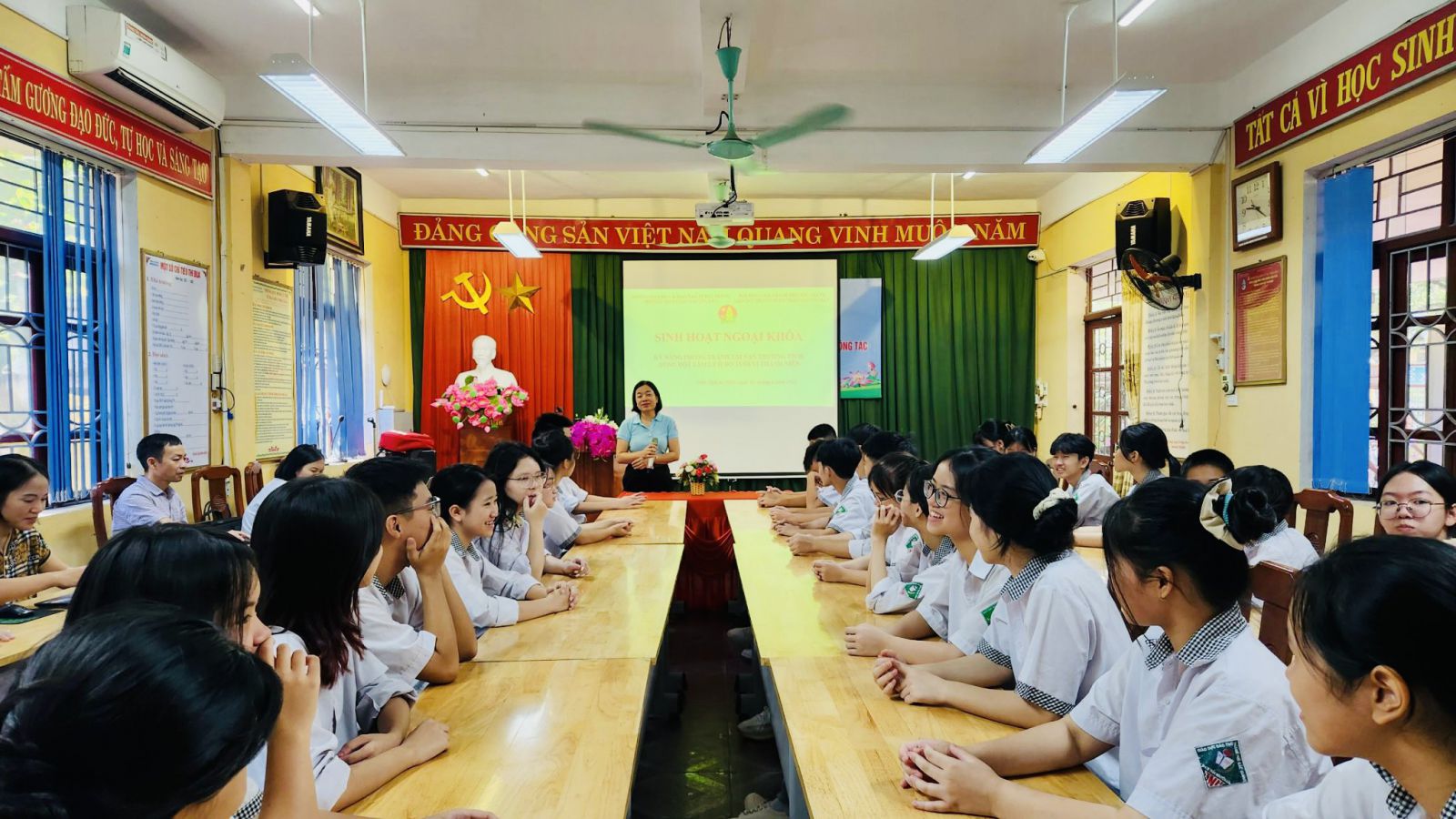 Tham dư buổi sinh hoạt có lãnh đạo nhà trường, cùng các thầy cô giáo chủ nhiệm, thầy cô phụ trách đội và hơn 80 em đội viên tiêu biểu học sinh khối 8,9. Tại chương trình, các em học sinh được nghe cô Bùi Thị Như Mỹ- giáo viên tổng phụ trách đội trao đổi về các nội dung: thế nào là tai nạn thương tích, xung đột tâm lý ở trẻ dưới vị thành niên; nhận biết về tai nạn thương tích và các biểu hiện của xung đột tâm lý ở tuổi vị thành niên; các biện pháp phòng và tránh một số tai nạn thương thích thường gặp và xung đột tâm lí,…