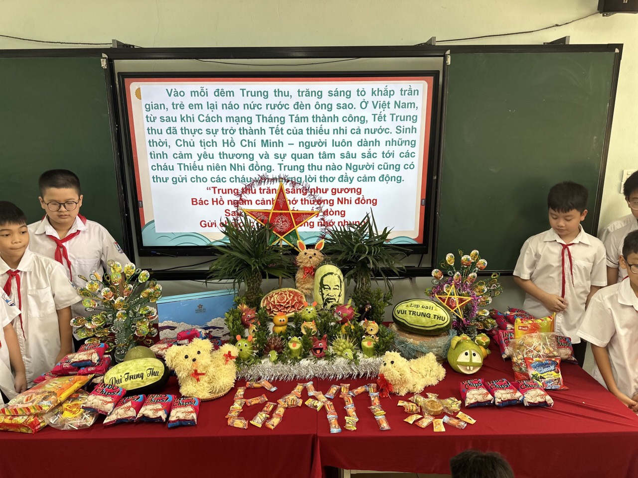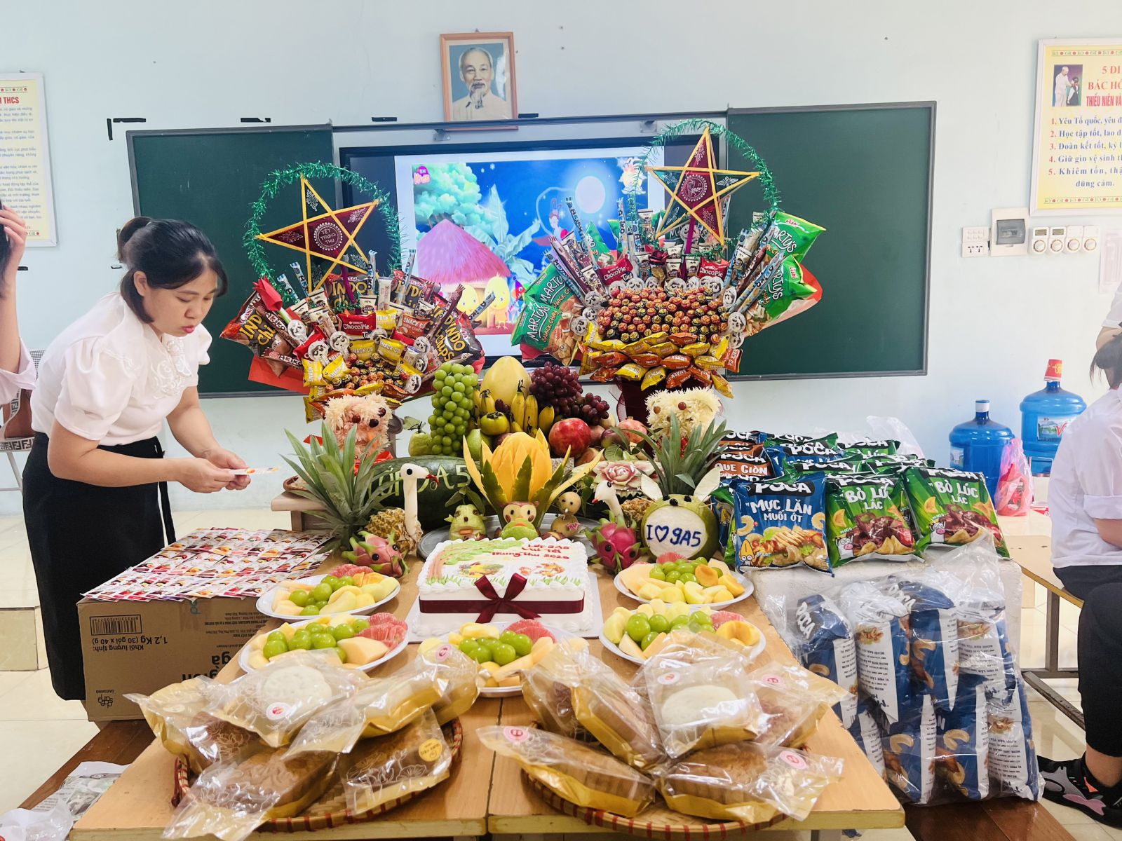 Với sự trang trí vô cùng tuyệt vời của các bạn thanh thiếu nhi, với những hình ảnh cô cùng quen thuộc ngay thơ trong sáng như: hình các chú lật đật, hình cá chép, hình đàn gà….. bên cạnh mâm cỗ trung thu, các loại bánh dẻo, bánh nướng cũng là thứ không thể thiếu. Ngôi sao tượng trưng cho ngôi sao trên bầu trời lấp lánh tỏa sáng khắp nhân gian.
