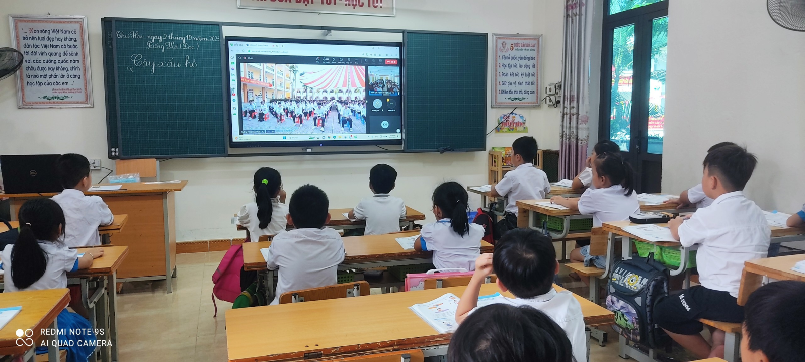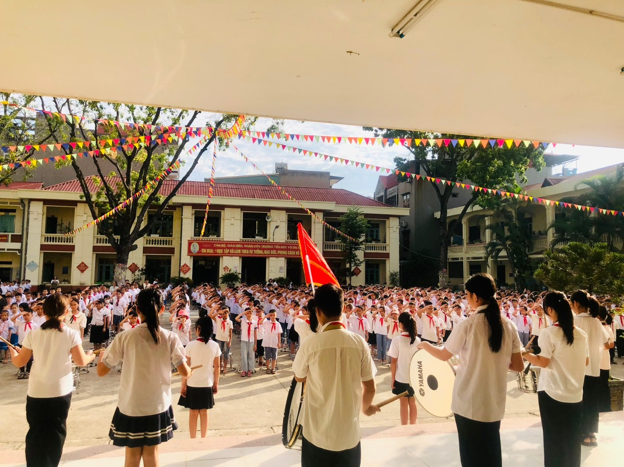 Giờ chào cờ sáng 02/10/2023 học sinh nghe tuyên truyền về Tuần lễ học tập suốt đời năm 2023 trước khi vào lớp dự Khai mạc