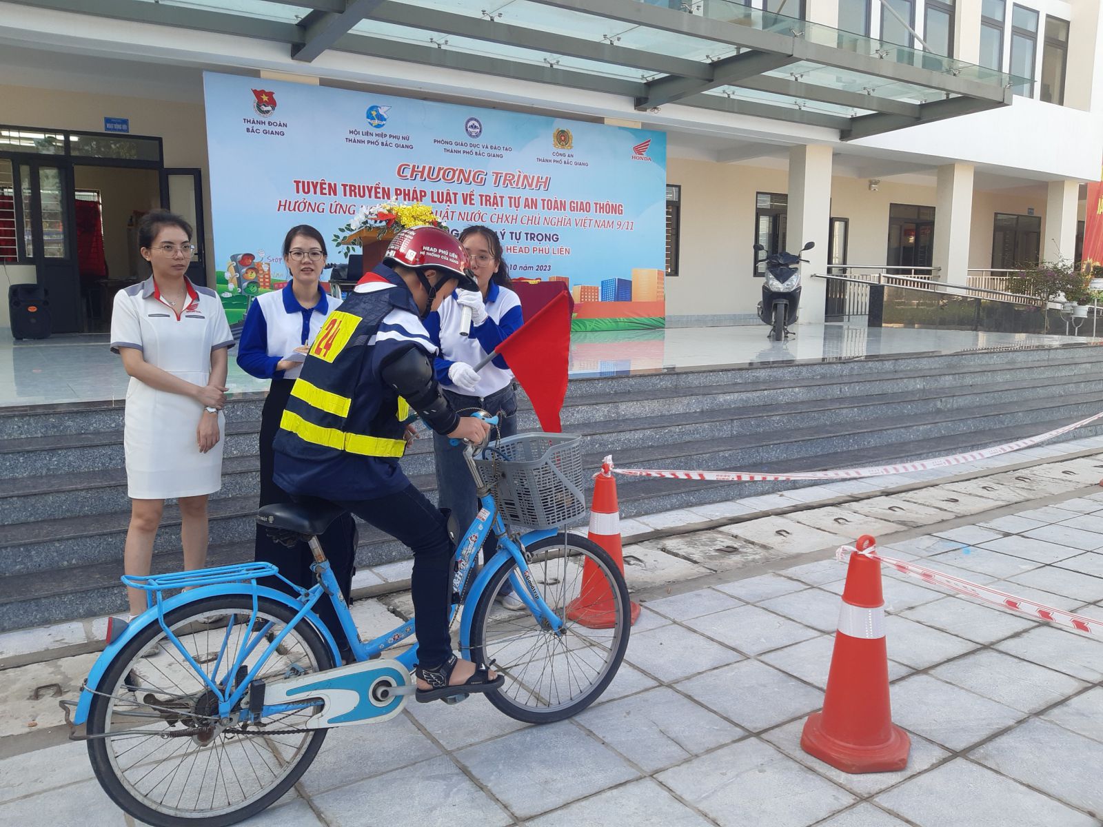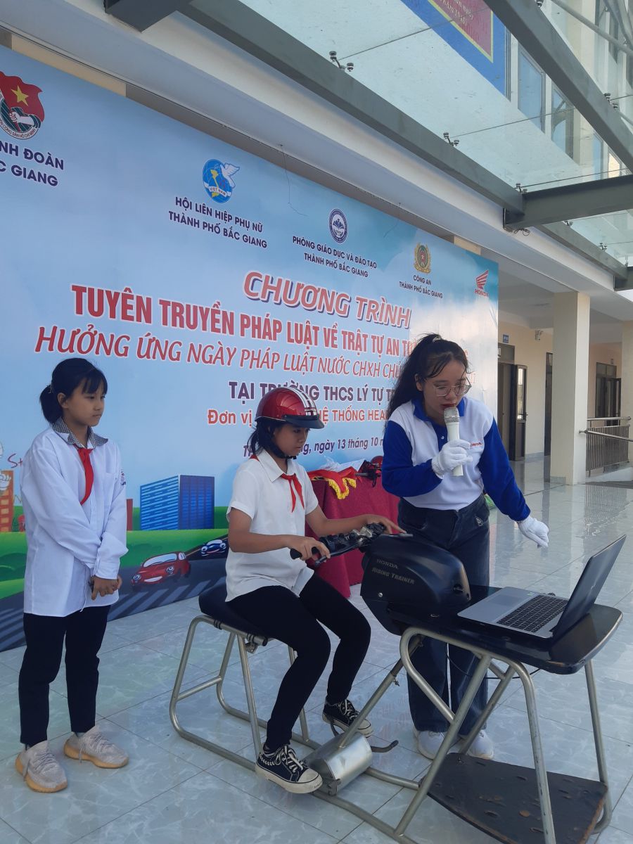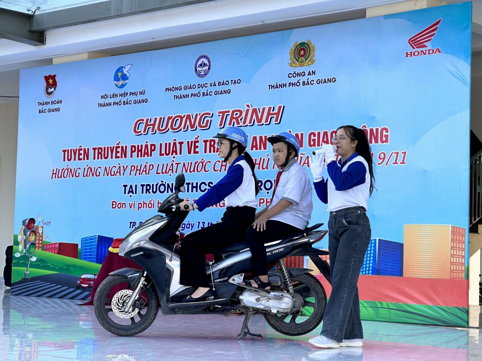 Thực hiện chương trình công tác Đội và phong trào thanh thiếu niên của thành đoàn Bắc Giang, kế hoạch của Phòng GD. Nhằm tuyên truyền và trang bị cho các em học sinh những kiến thức bổ ích về pháp lệnh và trật tự ATGT. Sáng ngày 13/10/2023. Liên đội trường THCS phối kết hợp Công ty Honđa Phú Liên, công an Bắc Giang, Đoàn thanh niên phường. Tổ chức chương trình tuyên truyền Pháp luật về trật tự ATGT.
