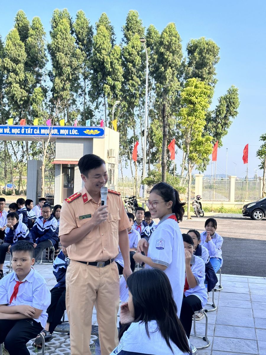 Tại buổi tuyên truyền, các em học sinh được giao lưu với đồng chí Hoàng Trọng Hiệp cán bộ cảnh sát giao thông đưa ra rất nhiều tình huống thực tế về vi phạm an toàn giao thông và cùng tìm hiểu việc tham gia giao thông hàng ngày của các em. Những vướng mắc chưa được sáng tỏ về các điều luật và các quy định về giao thông đường bộ. Qua đó cung cấp cho các em kiến thức, nội dung cơ bản của Luật Giao thông đường bộ, những kỹ năng, nguyên tắc đảm bảo an toàn khi tham gia giao thông và hình thức xử phạt đối với những lỗi thường gặp ở học sinh như: sử dụng ô khi tham gia giao thông, dàn hàng ngang, vượt làn đường, vượt đèn đỏ.… từ đó giúp các em nâng cao hiểu biết, ý thức trách nhiệm trong việc chấp hành nghiêm các quy định của pháp luật về trật tự an toàn giao thông và xây dựng văn hóa giao thông trong trường học.