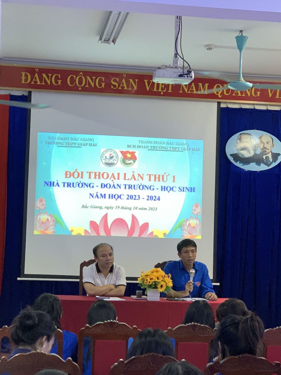 Được sự nhất trí của Đảng ủy - BGH nhà trường, chiều ngày 19/10/2023 Đoàn trường THPT Giáp Hải đã tổ chức đối thoại lần thứ 1, năm học 2023-2024 giữa: Nhà trường - Đoàn trường - Học sinh. Đại diện nhà trường có thầy Trần Văn Trung - Phó hiệu trưởng; đại diện BCH đoàn trường có đồng chí Nguyễn Thanh Hải, ĐUV - Bí thư đoàn trường và đại diện cho 1335 đoàn viên, thanh niên nhà trường có 60 đồng chí là Bí thư, lớp trưởng của 30 chi đoàn học sinh.