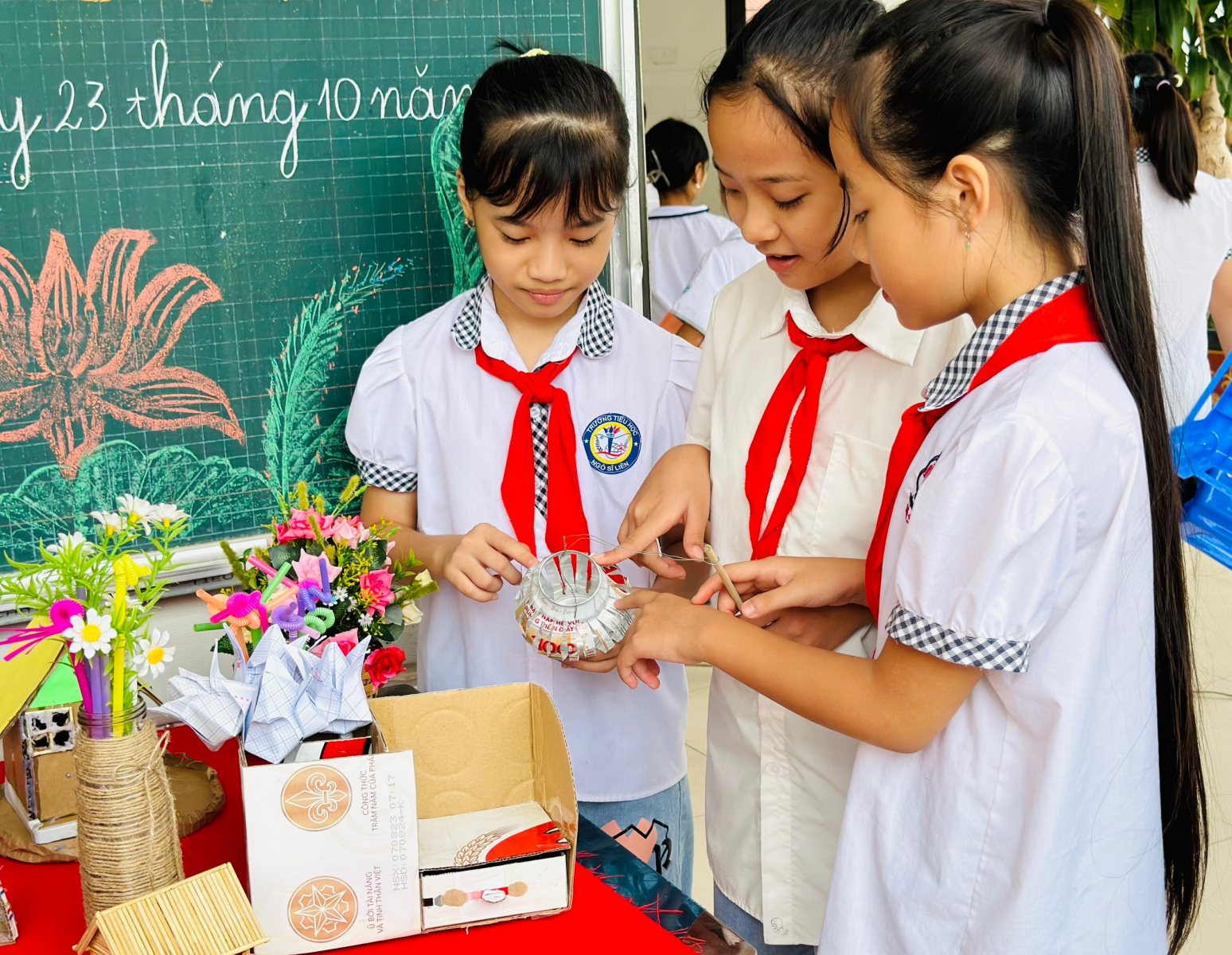 Trước đó trong tiết SHDC tuần 6,7 ngày 16; 23/10, Liên đội đã tổ chức tuần lễ xanh, trải nghiệm HĐ stem làm “Hộp bắt muỗi” “Hộp đựng bút” “Bộ số bí ẩn” “Đồ dùng từ vật liệu tái chế” của học sinh khối 3,4,5.