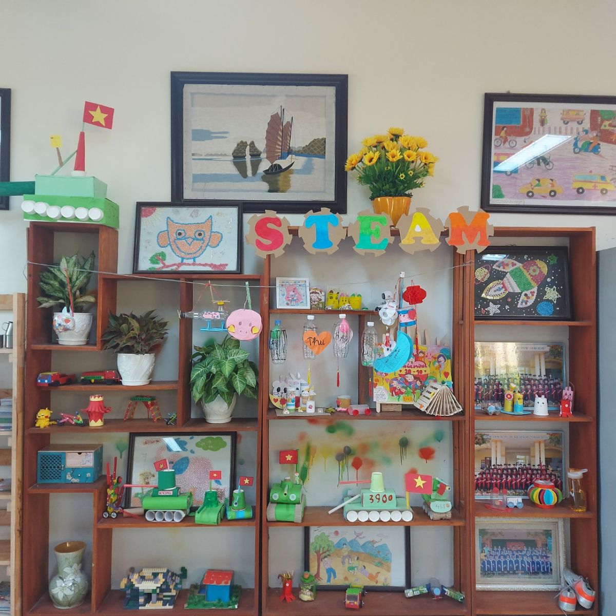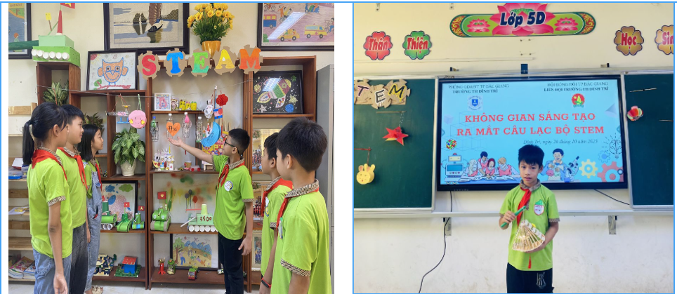 Trong buổi ra mắt CLB hôm nay, các bạn sẽ cũng được tham quan góc trưng bày STEM tại lớp 5D và nghe đại diện các bạn đã làm ra sản phẩm lên giới thiệu về quy trình làm ra sản phẩm của mình. Kết thúc buổi ra mắt CLB, bạn Nguyễn Thành Đạt thay mặt Ban chủ nhiệm thông báo nội dung sinh hoạt CLB tháng 11 theo chủ đề “Làm đồ dùng học tập của em” để các thành viên chuẩn bị vật liệu làm sản phẩm.