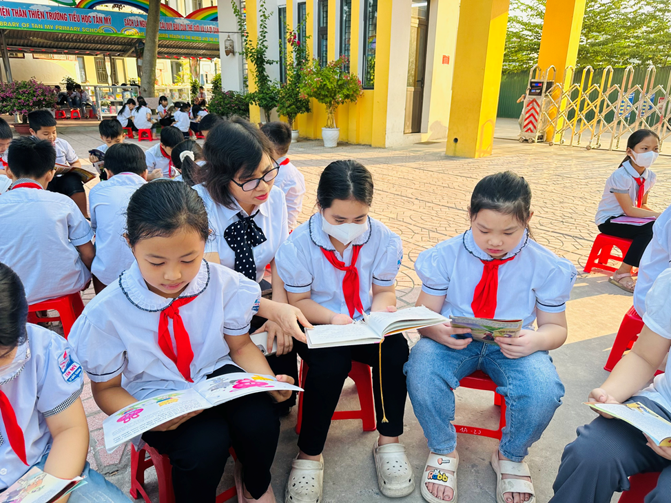 Được sự quan tâm của BGH và cha mẹ học sinh nhà trường, ngay từ đầu năm học, thư viện Trường Tiểu học Tân Mỹ đã được trang bị đầy đủ cơ sở vật chất, trang thiết bị để phục vụ cho tiết hoạt động thư viện. Theo chương trình thời khóa biểu, mỗi lớp có 1 tiết thoạt động Thư viện/tuần. Ngoài việc đọc sách theo hình thức truyền thống tại Thư viện, nhà trường luôn chú ý đến hoạt động “đọc sách ngoài trời” cho học sinh. Khác với đọc sách truyền thống trong phòng đọc của Thư viện thì “đọc sách ngoài trời” là một hình thức cho các em đọc truyện và đọc sách ngay ngoài sân trường, dưới bóng mát của những tán cây xanh. Ở đây, các em thực sự được chơi mà học, học mà chơi trong một không gian thoáng đãng, được hòa mình cùng với thiên nhiên. Các em được tự do lựa chọn những quyển sách truyện mà mình yêu thích. Nhờ những buổi đọc sách này mà tình bạn giữa các em ngày càng thêm gắn bó.