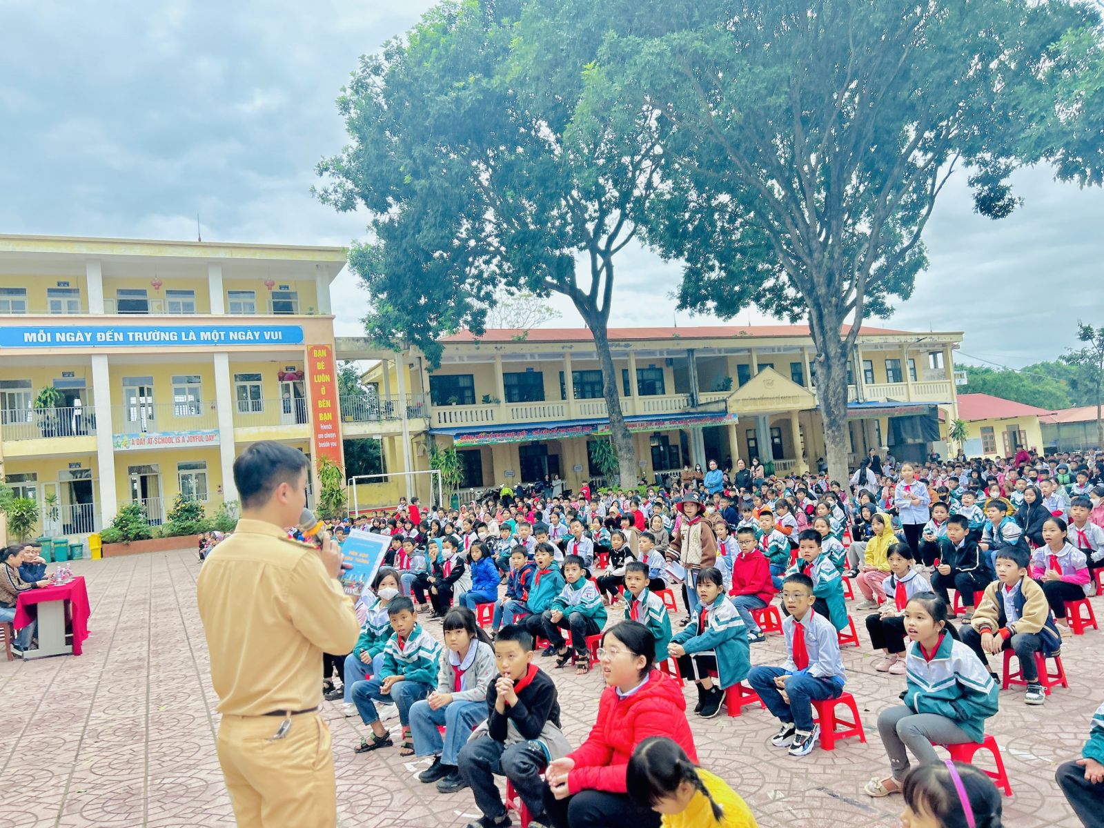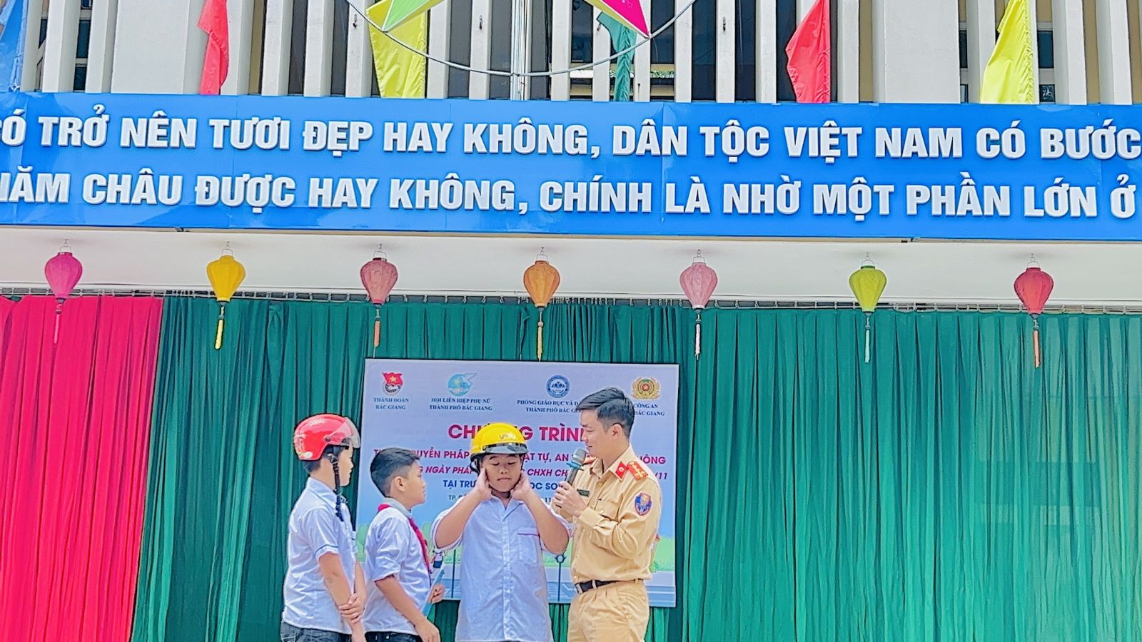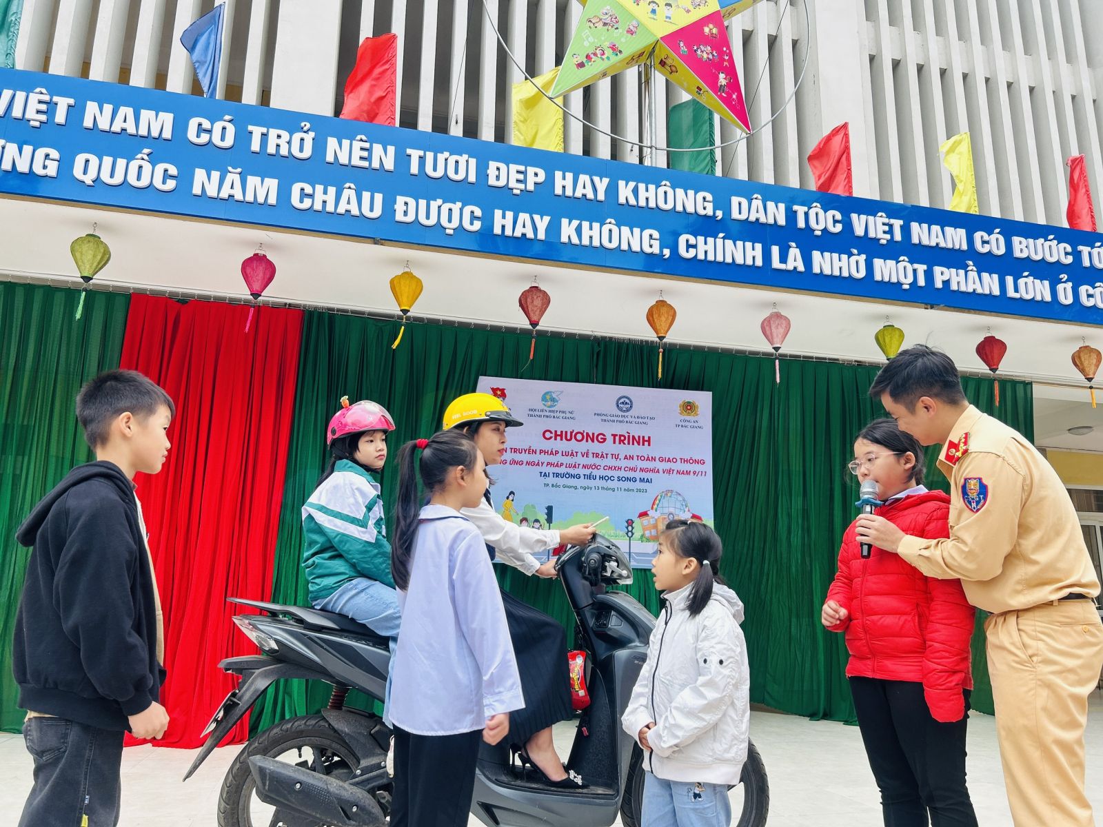 Tới dự buổi tuyên truyền có đồng chí Hoàng Trọng Hiệp - Cán bộ Đội CSGT - Công an TP Bắc Giang; Cô Nguyễn Thị Thu Hường - Bí thư chi bộ, Hiệu trưởng cùng toàn thể các thầy, cô giáo và hơn 1000 em học sinh Trường Tiểu học Song Mai.