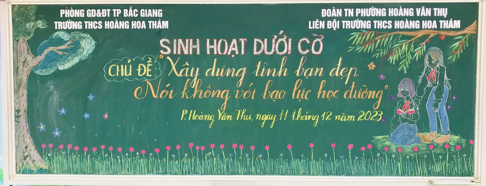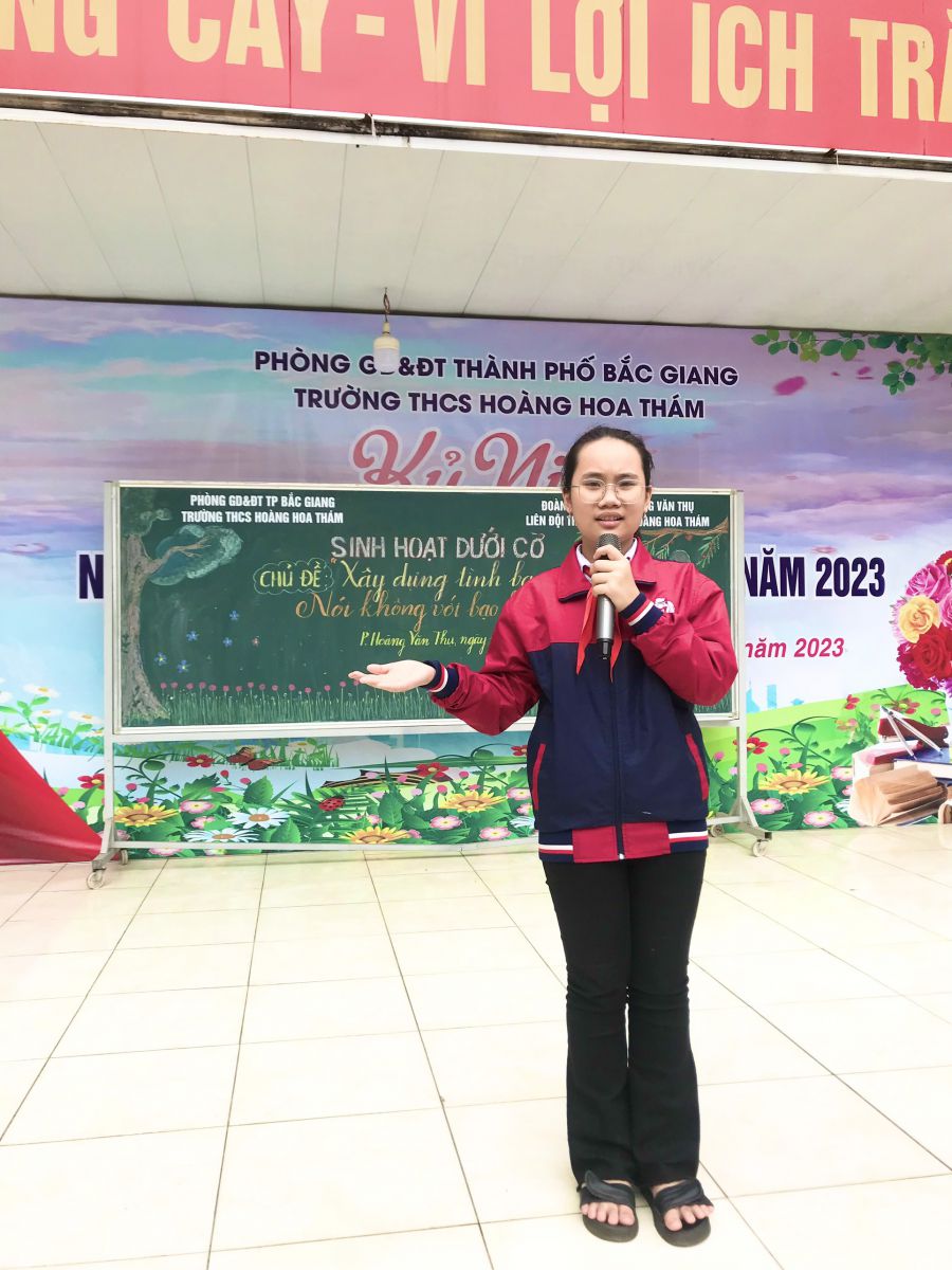 Bạo lực học đường không chỉ diễn ra theo hình thức đánh nhau, mà một số học sinh khác còn bị tấn công về mặt tinh thần. Điều này ảnh hưởng nghiêm trọng đến suy nghĩ, lối tư duy của học sinh bị bạo hành sau này. Nhận thức rõ tác hại của bạo lực học đường đối với học sinh và để giáo dục tuyên truyền phòng chống bạo lực học đường cho các em học sinh. Sáng thứ hai ngày 11/12/2023 Liên đội trường THCS Hoàng Hoa Thám tổ chức hoạt động sinh hoạt dưới cờ với chủ đề “Xây dựng tình bạn đẹp, nói không với bạo lực học đường” trong tiết chào cờ đầu tuần.