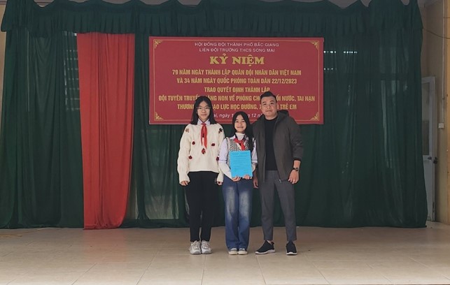 Trong buổi hoạt động hôm nay, Liên đội cũng tuyên bố thành lập Đội Phát thanh Măng non của nhà trường. Hai bạn Nguyễn Thị Khánh Tâm, lớp 8A1 và Nguyễn Hải Anh, lớp 7A3 đại diện lên nhận Quyết định thành lập Đội phát thanh Măng non.