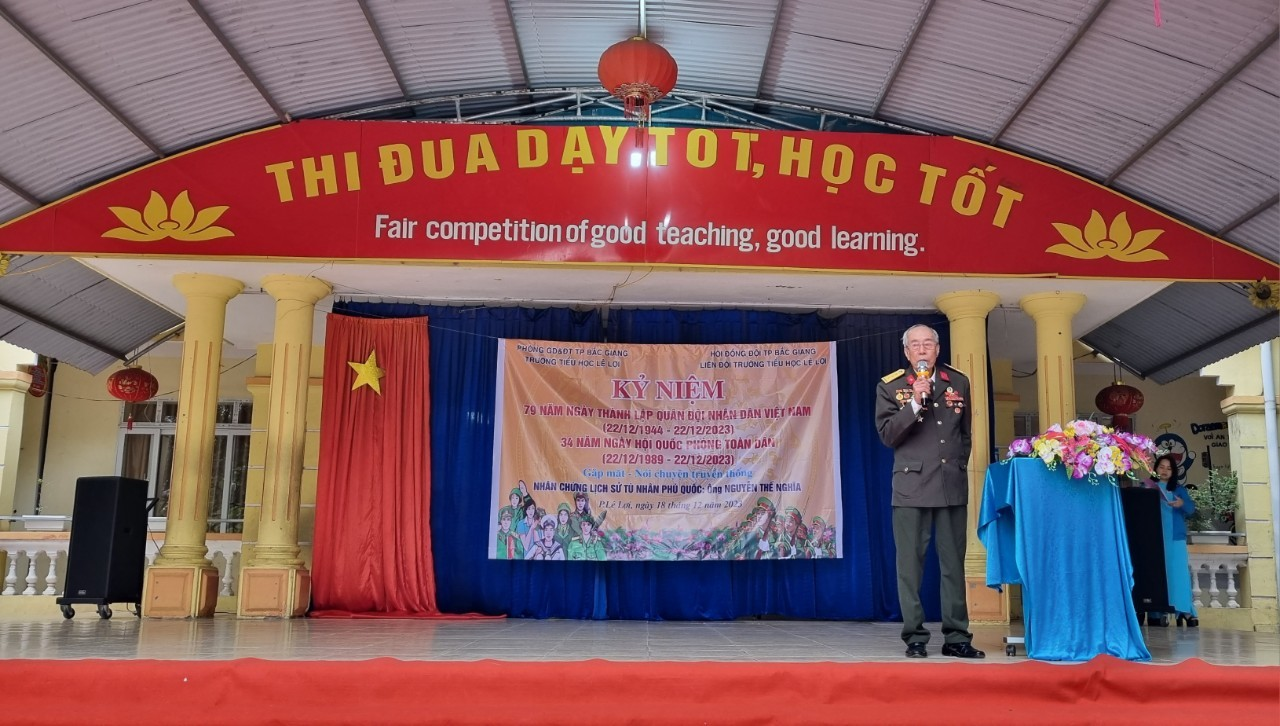 Nội dung Ôn lịch sử truyền thống 22/12 và Gặp mặt nhân chứng lịch sử, học sinh toàn trường đã được giao lưu và nghe ông Nguyễn Hoành Sơn - Chủ tịch Hội Cựu chiến binh phường Lê Lợi và ông Nguyễn Thế Nghĩa - một cựu tù nhân cách mạng tại nhà tù Phú Quốc - kể lại những câu chuyện lịch sử. Các em đã háo hức chờ đợi để được nghe nói chuyện về truyền thống cách mạng của QĐNDVN- CMVN để thấy được những sự hi sinh vô cùng to lớn của những người chiến sĩ cộng sản. Qua những câu chuyện ý nghĩa, các em được mở rộng hiểu biết về lịch sử dân tộc, từ đó, khơi gợi thêm lòng tự hào, tự tôn dân tộc, ý thức cách mạng trong thế hệ trẻ của dân tộc.