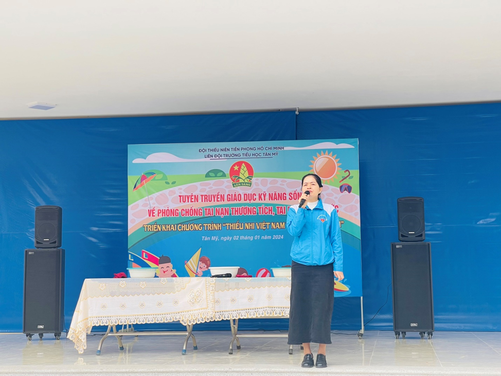 Tham dự buổi sinh hoạt có chị Lương Thị Nội-Bí thư Đoàn xã Tân Mỹ; Cô Lê Thị Sáng-Bí thư Chi bộ, Hiệu trưởng cùng toàn thể cán bộ giáo viên và hơn 1700 em học sinh nhà trường.