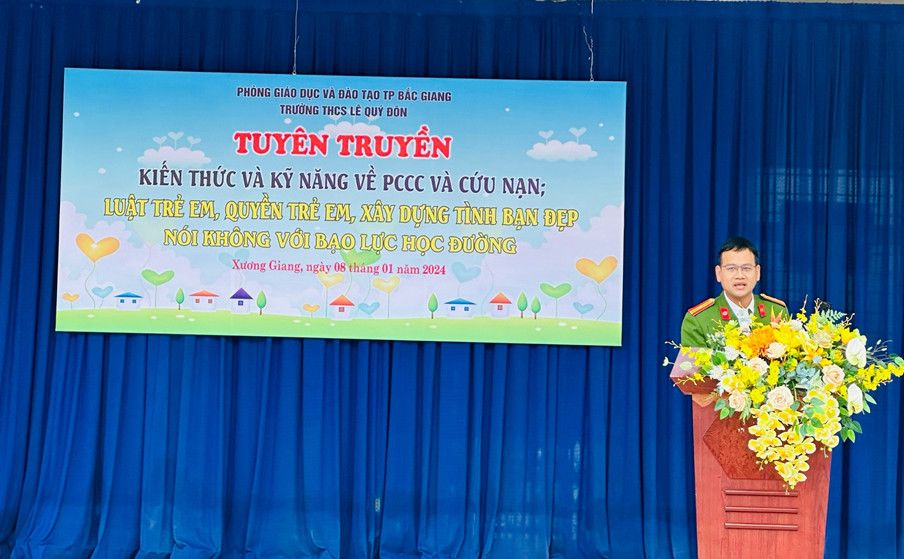 Việc trang bị kiến thức, kỹ năng PCCC và CNCH cho học sinh ngay từ khi còn trên ghế nhà trường là một trong những giải pháp chiến lược dài hạn trong việc đẩy mạnh công tác xây dựng phong trào “Toàn dân phòng cháy, chữa cháy” để hạn chế tối đa sự cố cháy, nổ và thiệt hại do cháy gây ra. Công tác PCCC chỉ thực sự hiệu quả khi mỗi người dân đều có kỹ năng để phòng chống cháy, nổ. Để làm được điều đó, việc tuyên truyền, giáo dục đối với lứa tuổi học sinh là vô cùng quan trọng, bởi đây chính là đối tượng có sức ảnh hưởng rất lớn đối với mỗi gia đình, toàn xã hội và đây cũng là lực lượng lao động kế cận, chủ nhân tương lai của đất nước. Đến dự và thực hiện buổi tuyên truyền có các đồng chí: Trần Ngọc Tú thượng tá- đội trưởng đội PCCC công an thành phố Bắc Giang; đồng chí Lê Thanh Quyết, thiếu tá - cán bộ PCCC công an TP Bắc Giang; Đc Nguyễn Hữu Lộc, thiếu úy – cán bộ PCCC công an TP Bắc Giang.