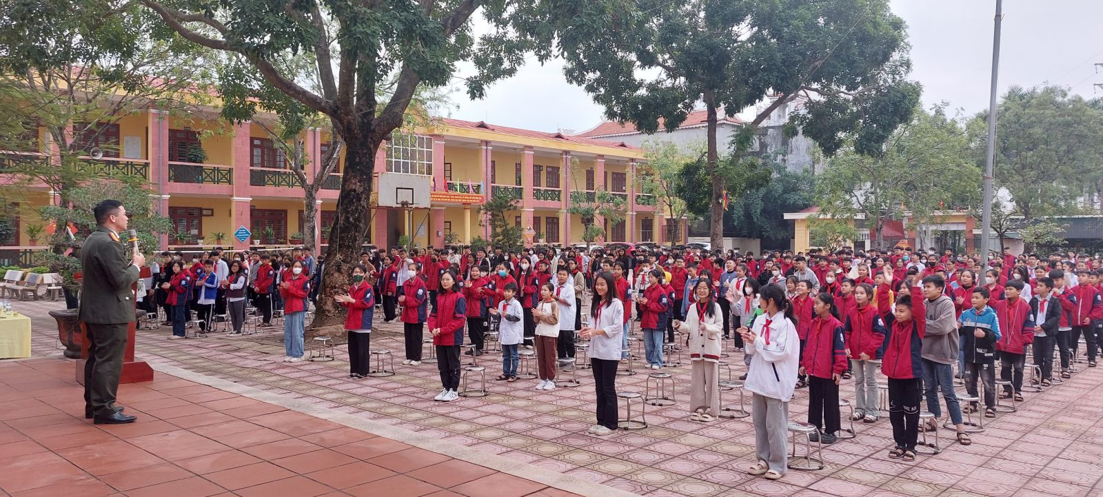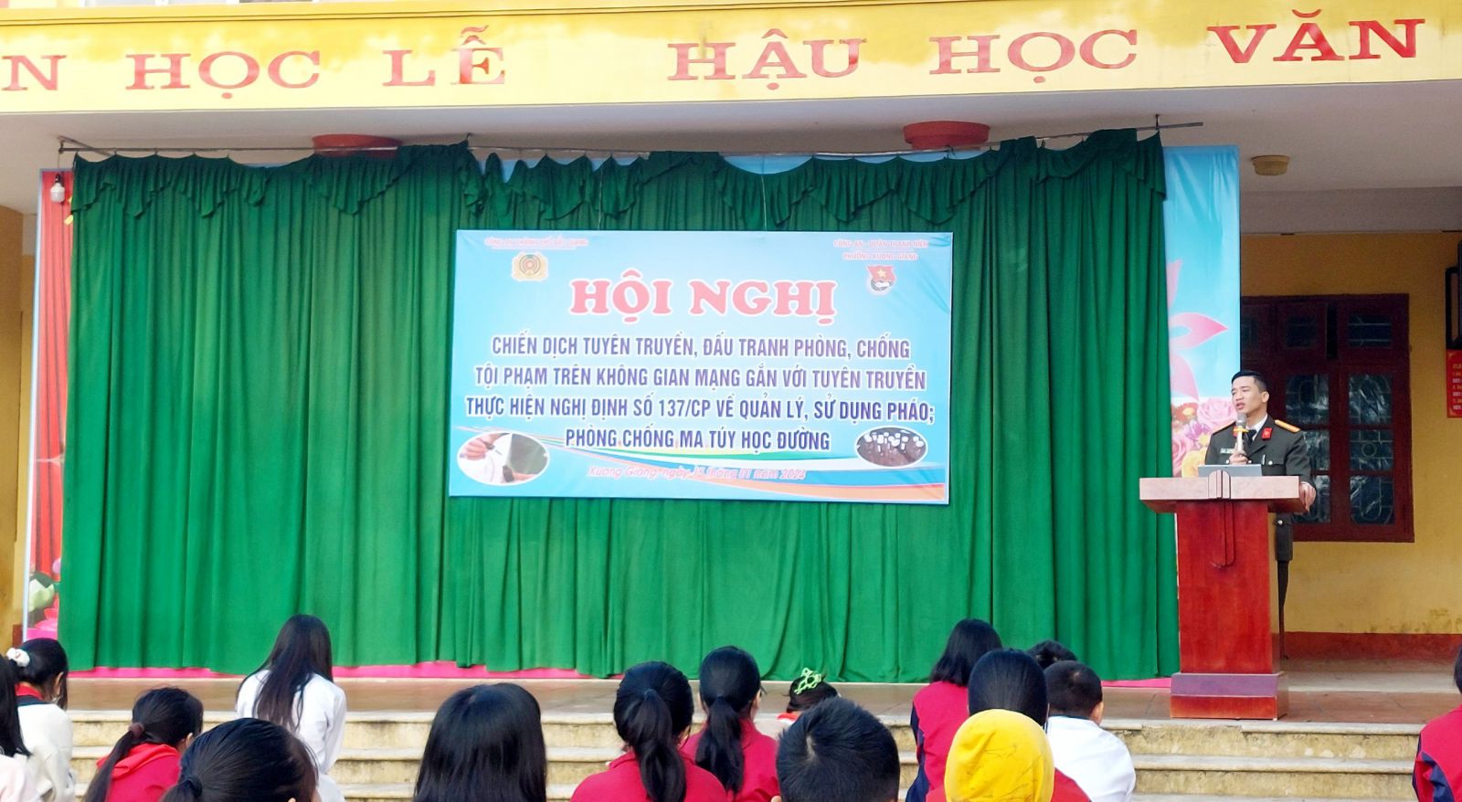 Tại buổi tuyên truyền, đồng chí Thiếu tá Tạ Văn Sơn thông tin đến CBGV và học sinh nắm được các phương thức, thủ đoạn của tội phạm lừa đảo chiếm đoạt tài sản thông qua mạng internet, từ đó giúp giáo viên và học sinh có ý thức cảnh giác, chủ động bảo vệ tải sản và tố giác với cơ quan chức năng khi phát hiện nghi vấn hoạt động phạm tội lừa đảo chiếm đoạt tài sản. Đồng thời tại buổi tuyên truyền đồng chí Sơn phổ biến về các điểm chính trong Nghị định 137/CP của Chính Phủ về quản lý, sử dụng pháo; Luật quản lý, sử dụng vũ khí, vật liệu nổ, công cụ hỗ trợ. Qua đó giúp giáo viên và các em học sinh phân biệt được các loại pháo (pháo nổ, pháo hoa); nắm được quy định về sử dụng pháo hoa; phản ánh tình trạng buôn bán, vận chuyển, tàng trữ đốt pháo: các chất kích thích, gây nghiện và các quy định cụ thể về hình thức xử lý các hành vi vi phạm. Bằng hình thức tuyên truyền trực tiếp và giao lưu tương tác 2 chiều, các em học sinh cũng đã nhận thức rõ hơn về sự nguy hiểm của việc sử dụng pháo nổ, sử dụng ma túy hay các chất kích thích.