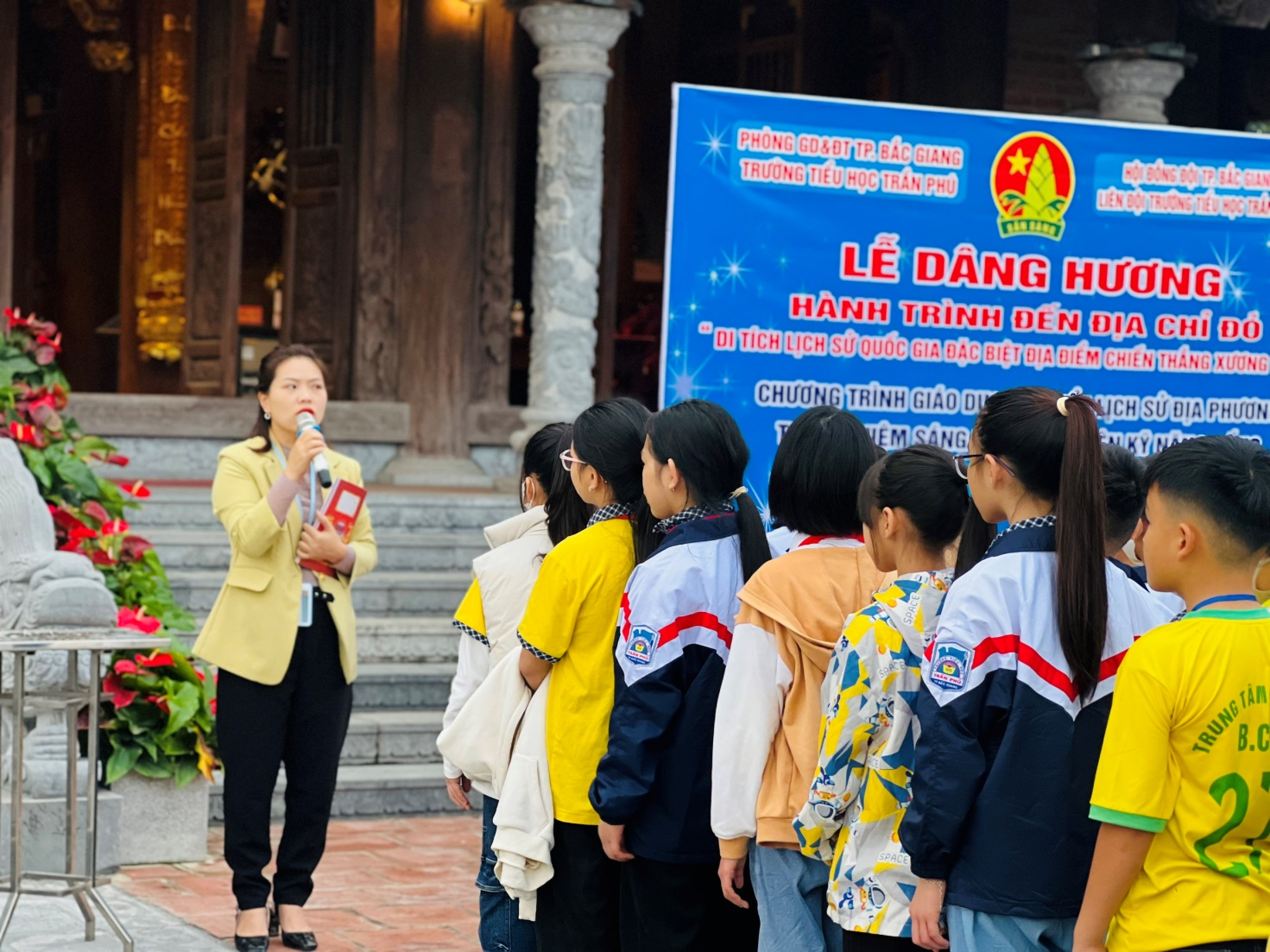 Sau lễ dâng hương các thầy cô giáo và các em học sinh được nghe hướng dẫn viên khu di tích thuyết minh giới thiệu về sự hình thành, ý nghĩa lịch sử Khu di tích Quốc gia đặc biệt địa điểm Chiến thắng Xương Giang và các công trình khác như khu di tích đền Xương Giang, Nhà biểu diễn và Trưng bày nghệ thuật. Thành Xương Giang do quân Minh xây dựng vào thế kỷ thứ 15, năm 1407, trong thời gian nhà Minh đô hộ Việt Nam.. Thành được xây bằng đất, các dấu tích còn lại cho biết thành hình chữ nhật, chiều dài theo hướng Đông-Tây đo được 600m, chiều rộng theo hướng Bắc - Nam 450m, diện tích 27ha, tường đắp đất...Thành Xương Giang là minh chứng quan trọng cho việc quyết định thắng lợi của Cuộc khởi nghĩa Lam Sơn, chấm dứt 20 năm đô hộ của nhà Minh, giành tự do cho đất nước. Năm 2007, Thành phố đã khánh thành Đền Xương Giang thờ vua Lê Lợi, tướng lĩnh và các anh hùng. Công trình được coi như di tích của thành phố đồng thời thể hiện sự kính trọng, biết ơn các anh hùng.