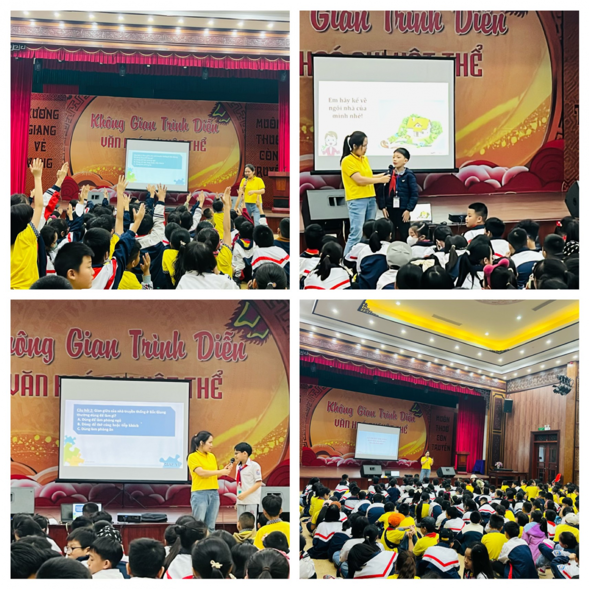Hoạt động tiếp theo các em được tập trung tại khu vực “Ký ức Xương Giang”, tại đây các thấy cô giáo giảng dạy cho các em các bài học lịch sử về các lễ hội, một số nét văn hóa ở thành phố Bắc Giang. Nơi đây có nhiều di tích văn hóa, lịch sử ,lễ hội gắn với quá trình phát triển của một đô thị trù phú, giàu truyền thống, hiểu được ý nghĩa của mỗi lễ hội trong văn hóa đời sống tâm linh của con người Bắc Giang. Mô tả được một số nét về văn hóa, truyền thống của Bắc Giang.
