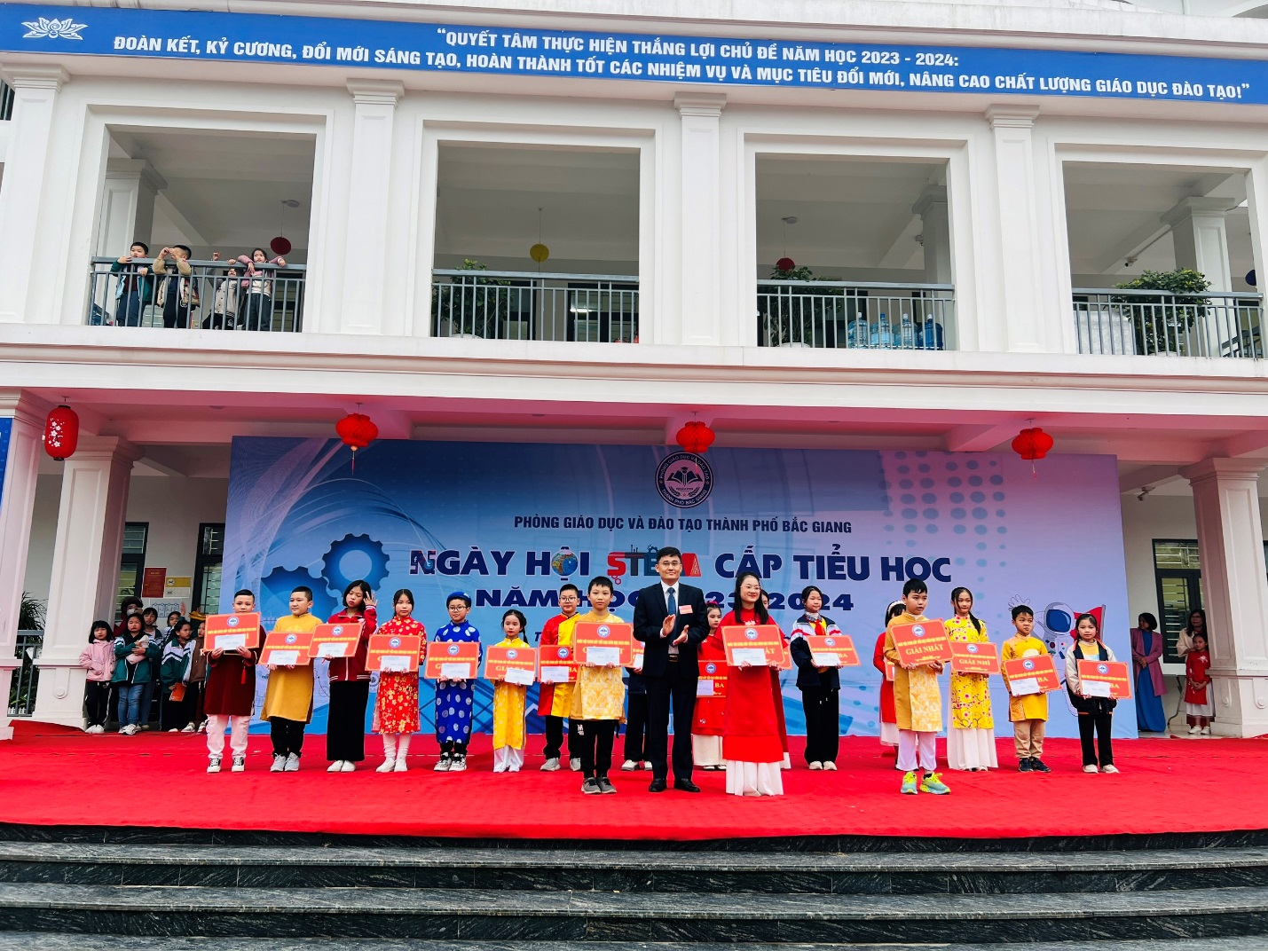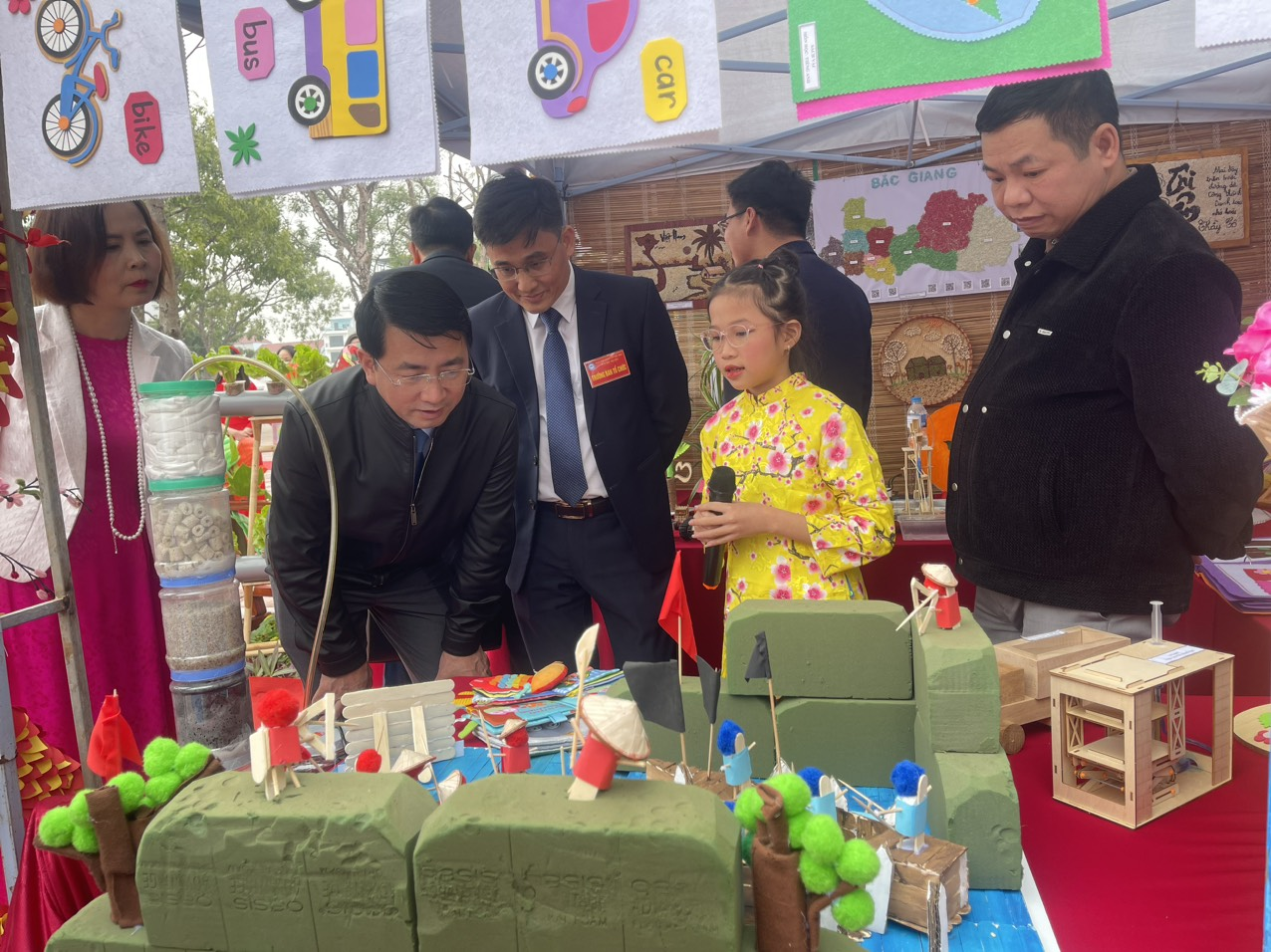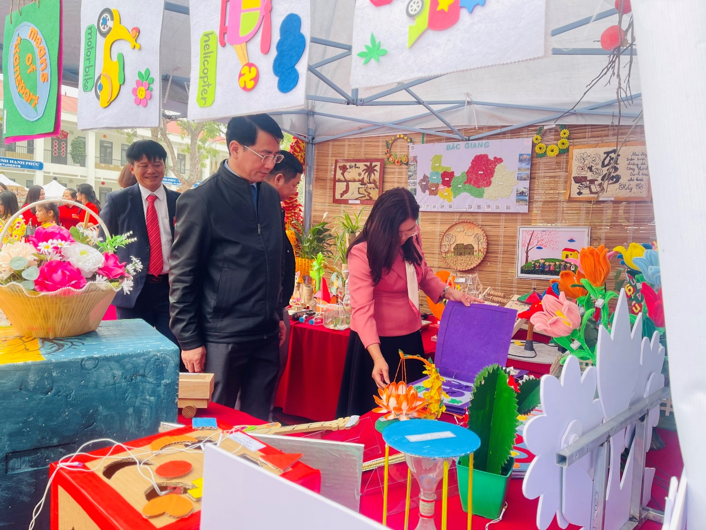 Trường Tiểu học Tân Tiến cùng với 17 trường tiểu học trên địa bàn thành phố Bắc Giang đã rất tích cực tham gia ngày hội. Tại ngày hội, Trường Tiểu học Tân Tiến đã tham gia triển lãm và trưng bày sản phẩm, giới thiệu và thuyết minh các sản phẩm STEM. Gian hàng của trường được trang trí với các sản phẩm trong gian hàng do học sinh tự nghiên cứu, chế tạo. Các sản phẩm đều an toàn cho người sử dụng, không có nguyên liệu gây cháy, nổ, ô nhiễm môi trường... và có mục đích áp dụng vào thực tiễn. Sản phẩm được trưng bày một cách logic, gọn gàng. Khi có khách ghé thăm gian hàng, học sinh của trường tthuyết trình giới thiệu gian hàng một cách tự tin. Ngoài ra gian hàng của trường còn bố trí góc trải nghiệm làm hoa đào từ dây kẽm nhung cho khách tham quan gian hàng.