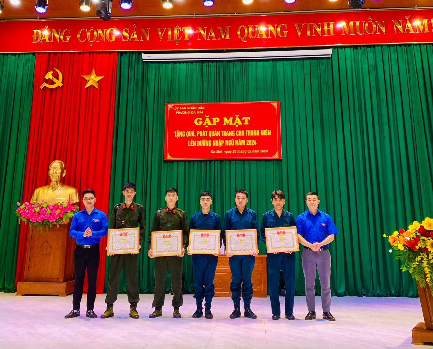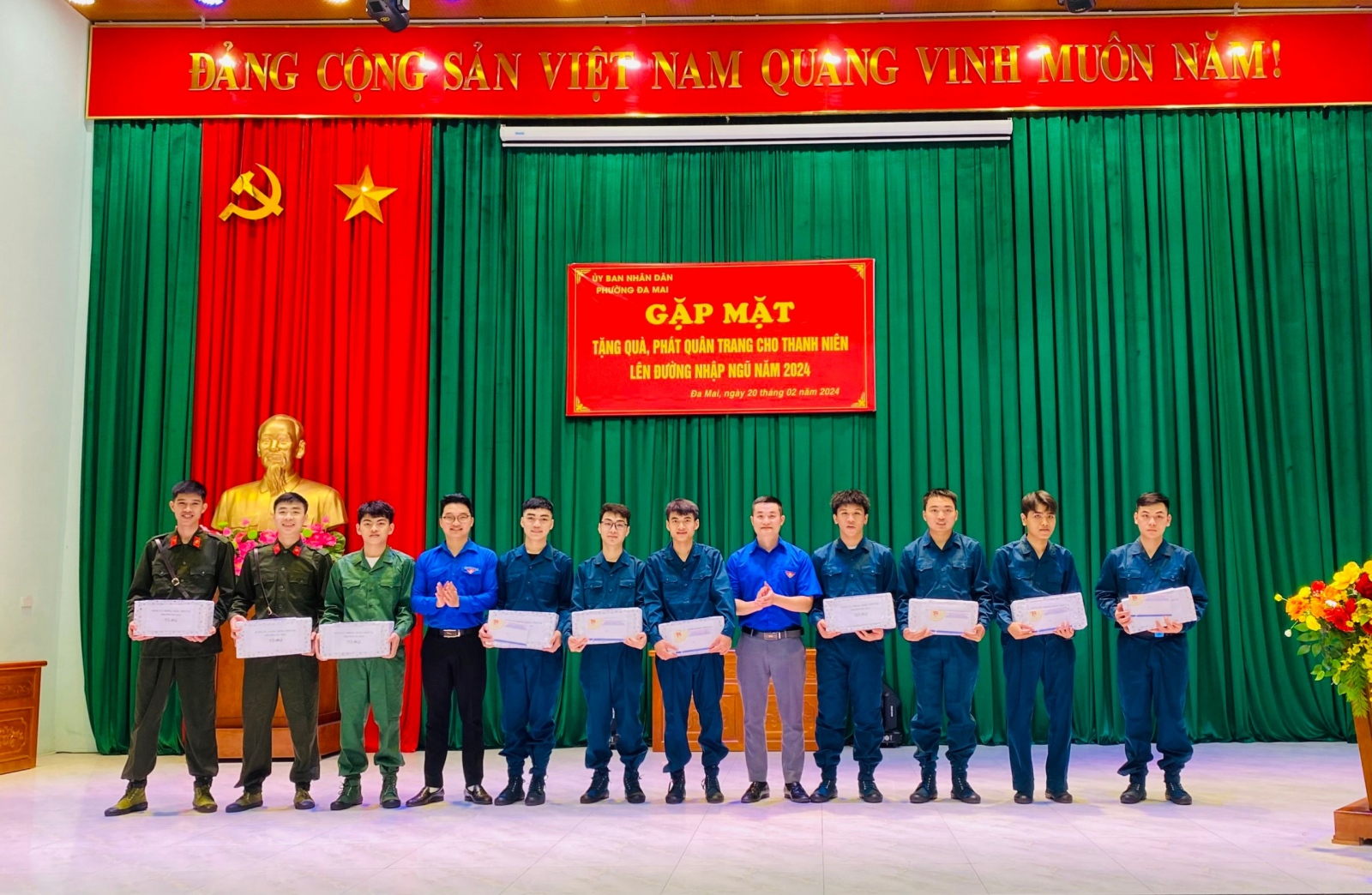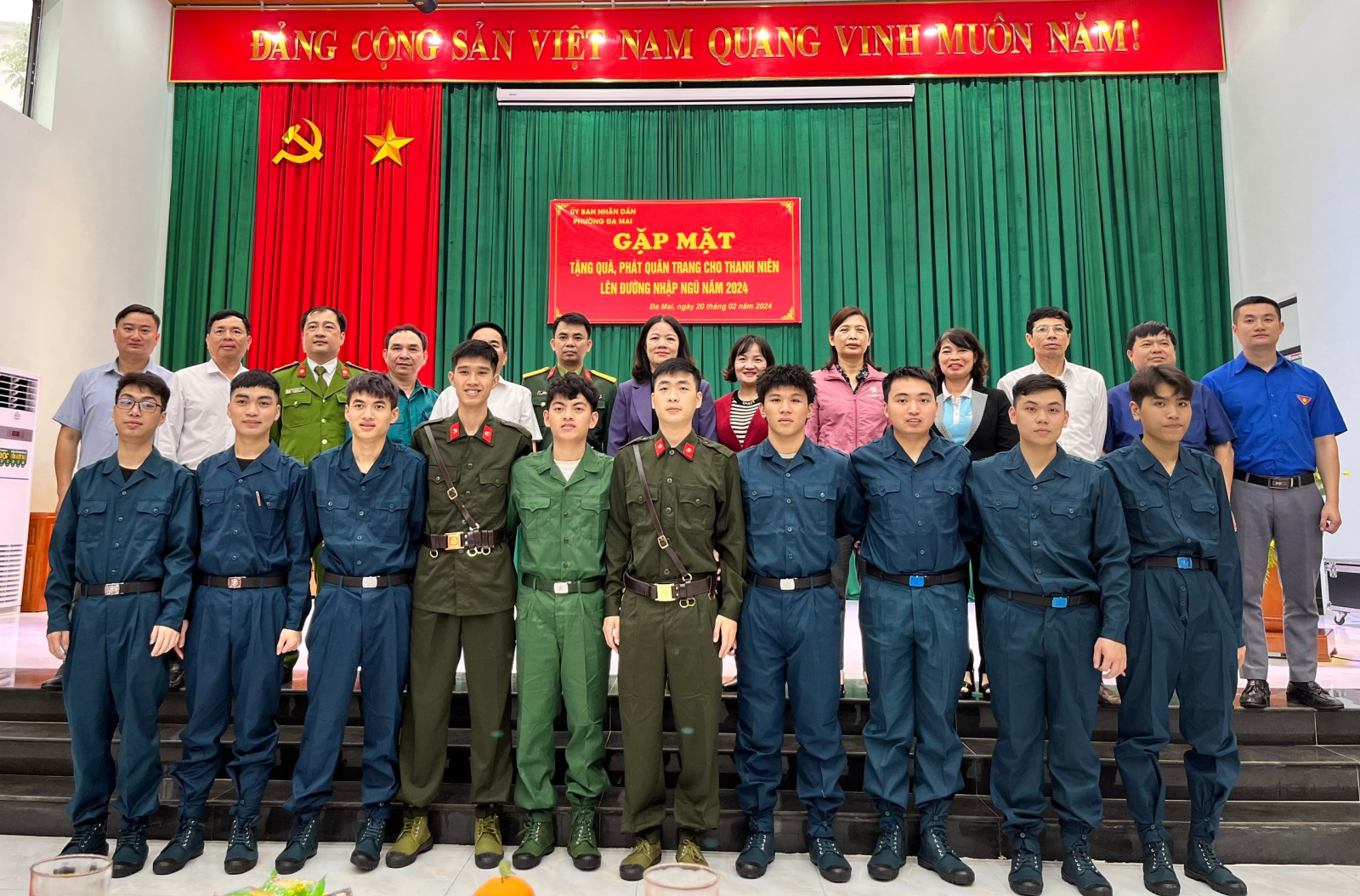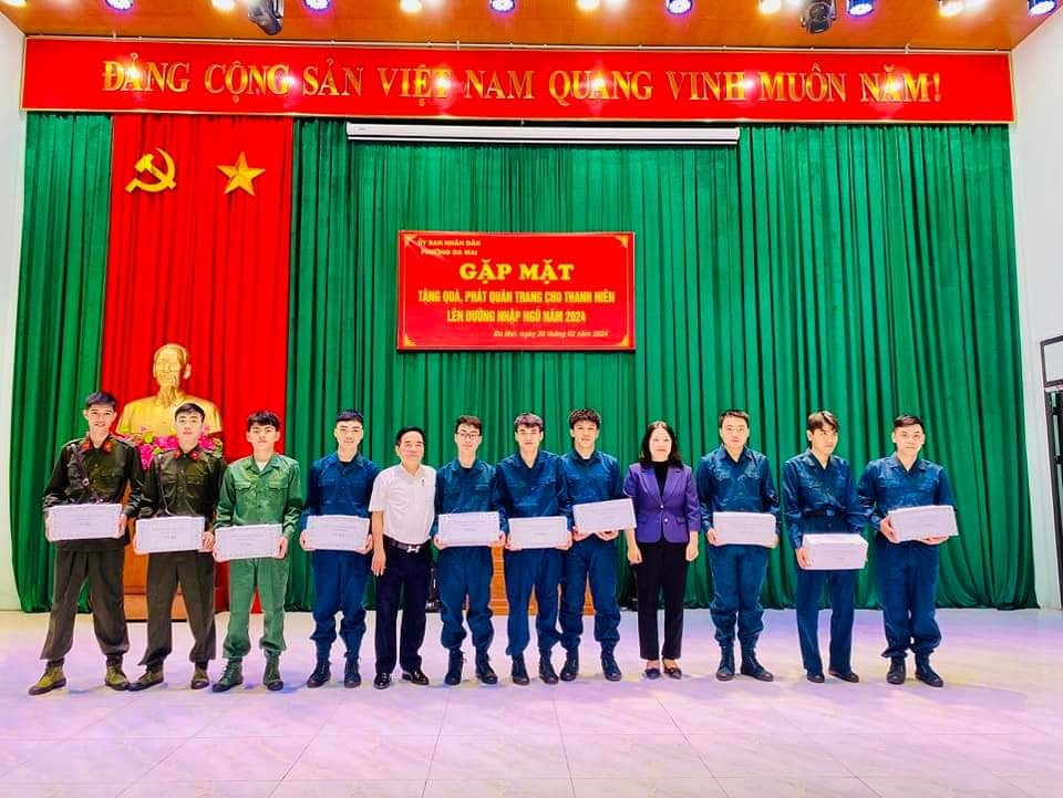 Thực hiện kế hoạch của Hội đồng NVQS thành phố Bắc Giang về việc tuyển chọn và gọi công dân nhập ngũ năm 2024. Chiều ngày 20/02/2024 Đảng ủy – HĐND - UBND, UBMTTQ, Hội đồng nghĩa vụ quân sự phường Đa Mai tổ chức gặp mặt, tặng quà và phát quân trang cho thanh niên nhập ngũ năm 2024. Về dự buổi gặp mặt có đồng chí Nguyễn Thị Thanh Hồng - Giám đốc TT Y tế thành phố Bắc Giang, thành viên HĐNV quân sự thành phố Bắc Giang – phụ trách đơn vị phường Đa Mai, đồng chí Nguyễn Văn Long - Trợ lý Tác huấn - Ban CHQS thành phố phụ trách phường Đa Mai; Đại biểu phường có đồng chí Phùng Thị Thu Hiền – ThUV, Bí thư Đảng ủy phường, các đồng chí Thường trực Đảng ủy, HĐND, UBND, UBMTTQ, Trưởng Công An, trưởng các đoàn thể CT - XH của phường, các đồng chí Bí thư chi bộ, tổ trưởng TDP có thanh niên nhập ngũ, Đặc biệt là 10 thanh niên nhập ngũ năm 2024.