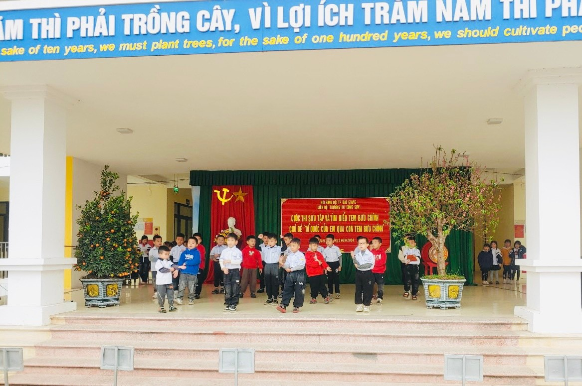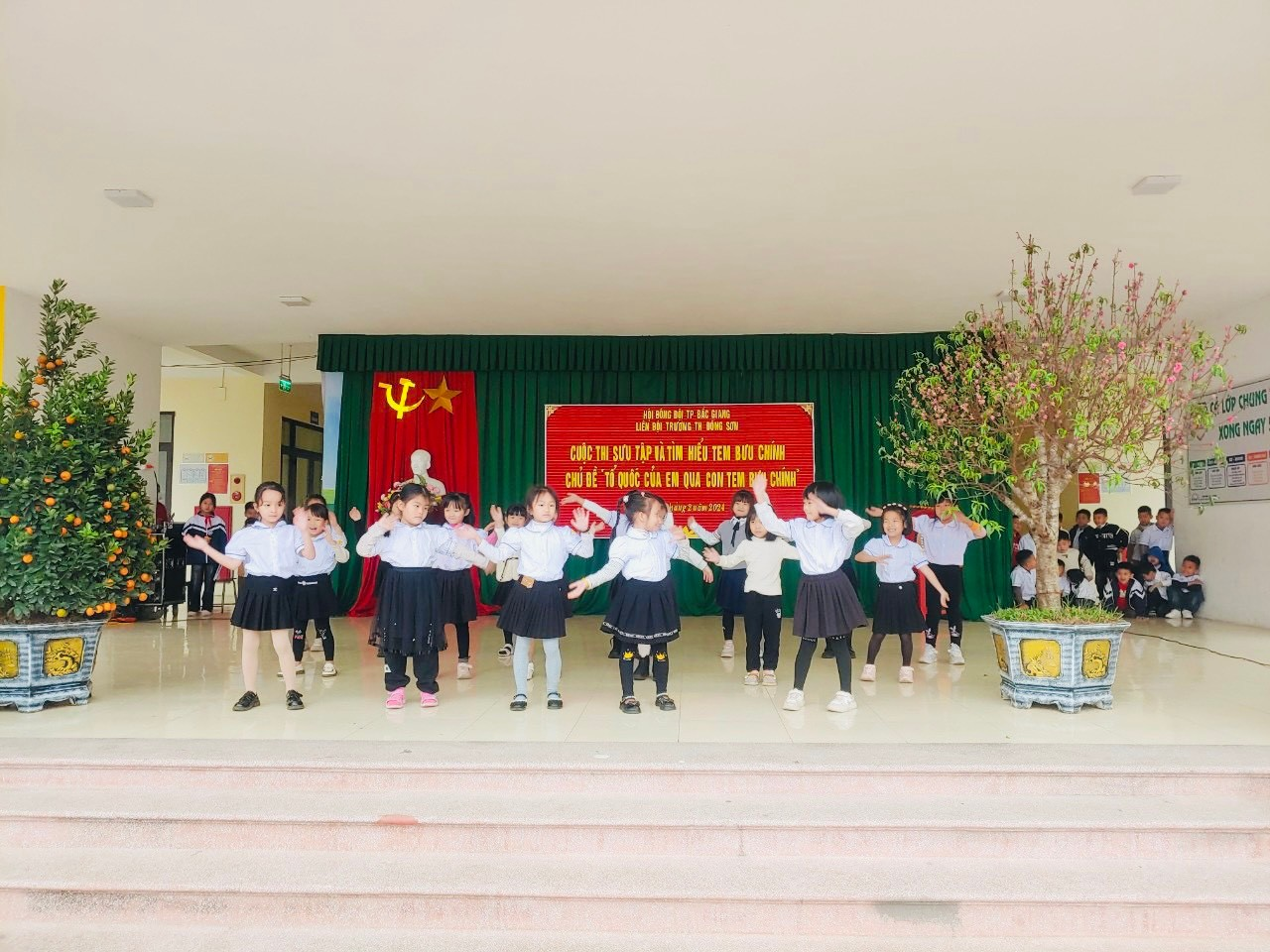 Thực hiện Chương trình Công tác Đội và phong trào thiếu nhi năm học 2023 - 2024 về việc triển khai cuộc thi sưu tập Tem Bưu chính năm 2024 với chủ đề “Tổ quốc của em qua con tem bưu chính” năm 2024. Hôm nay, ngày 26/02/2024, trong giờ chào cờ đầu tuần Trường Tiểu học Đồng Sơn đã triển khai cuộc thi tới toàn thể các em học sinh trong trường.