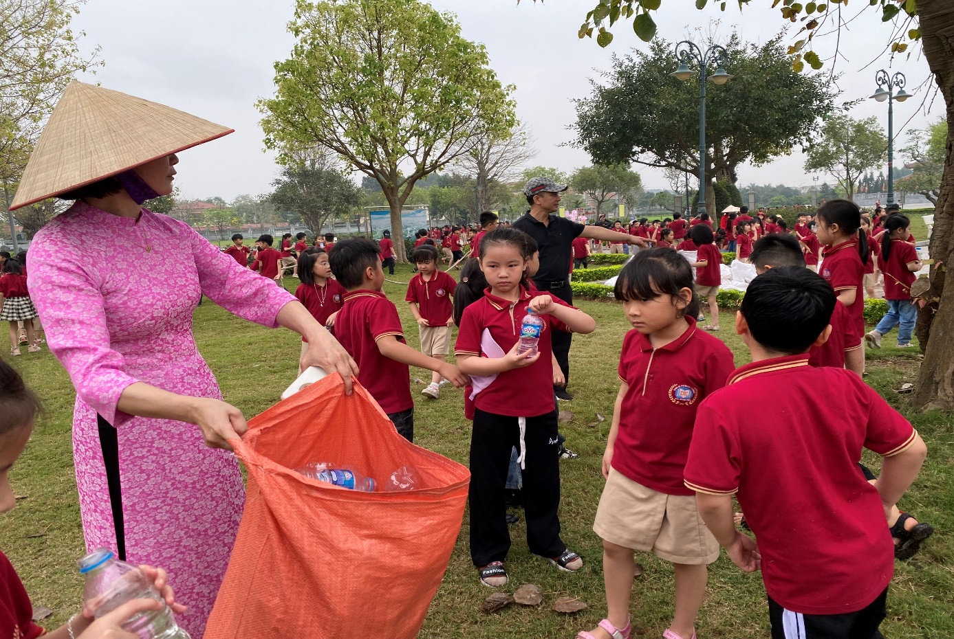 Trước khi kết thúc buổi trải nghiệm, cô và trò trường khối lớp 1, 2 trường Tiểu học Dĩnh Kế đã có 01 phút cùng chung tay làm sạch không gian địa điểm Chiến thắng Xương Giang, giữ cho môi trường xung quanh luôn sạch đẹp.