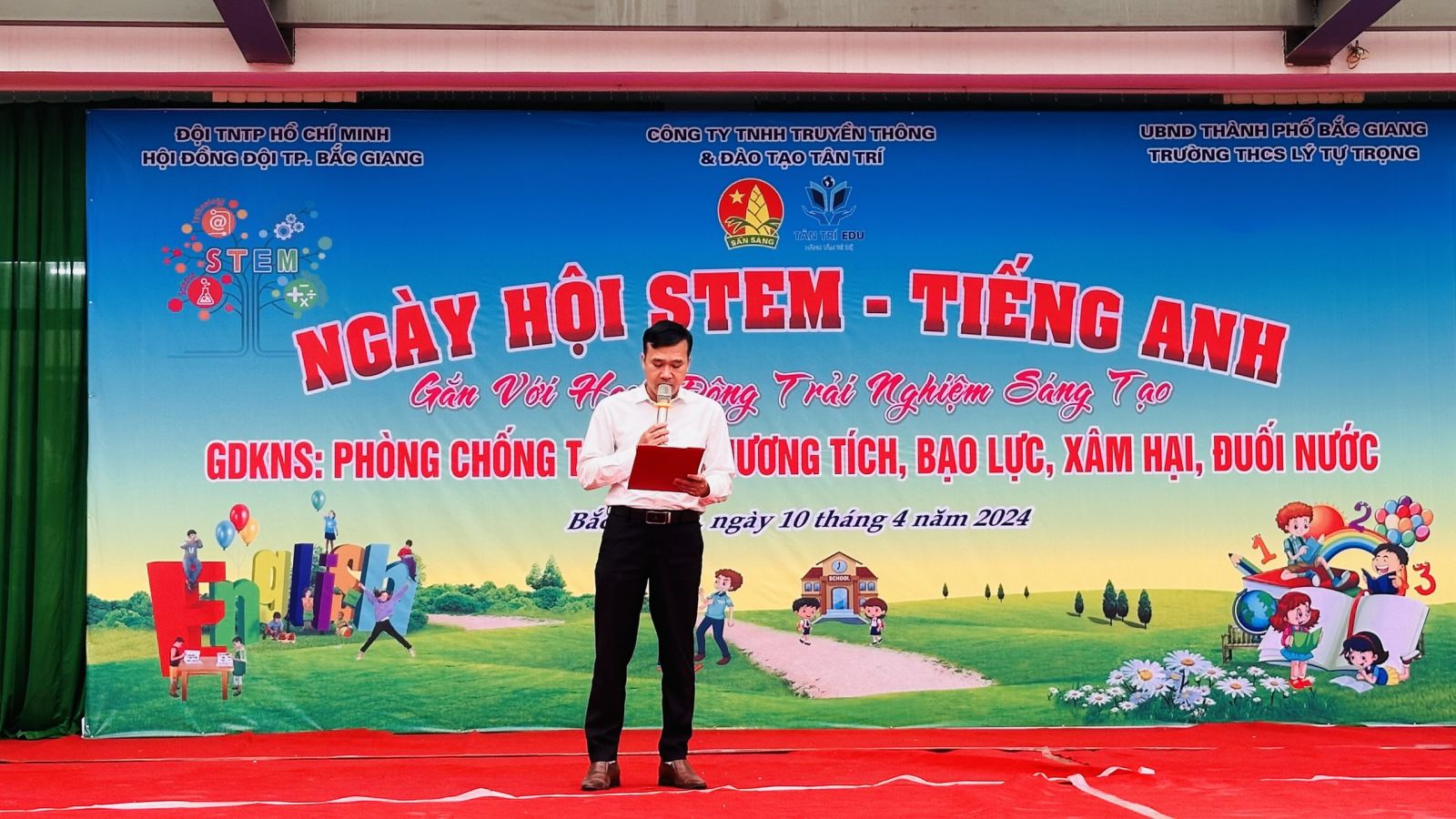Thực hiện kế hoạch số 36/GDĐT ngày 30/8/2023 của phòng Giáo Dục thành phố Bắc Giang về việc triển khai các hoạt động Tiếng Anh năm học 2023-2024; Thực hiện theo chương trình công tác Đội của thành đoàn Bắc Giang; Thực hiện kế hoạch số 02/KH-THCSLTT ngày 28/3/2024 của Trường THCS Lý Tự Trọng về việc tổ chức ngày Hội STEM, tiếng Anh năm học 2023-2024. Được sự nhất trí của lãnh đạo phòng GD&ĐT thành phố, sáng ngày 10/4/2024 Trường Trung học cơ sở Lý Tự Trọng, thành phố Bắc Giang đã tổ chức sự kiện đặc biệt mang tên "Ngày Hội STEM - Tiếng Anh gắn với hoạt động giáo dục kỹ năng sống với chủ đề phòng chống tai nạn thương tích, bạo lực, xâm hại, đuối nước”. Sự kiện này không chỉ là một cơ hội để học sinh tham gia vào các hoạt động sáng tạo và giáo dục, mà còn là dịp để mỗi học sinh trang bị thêm các kiến thức, kỹ năng sống quan trọng góp phần tạo ra một môi trường học tập an toàn và tích cực.