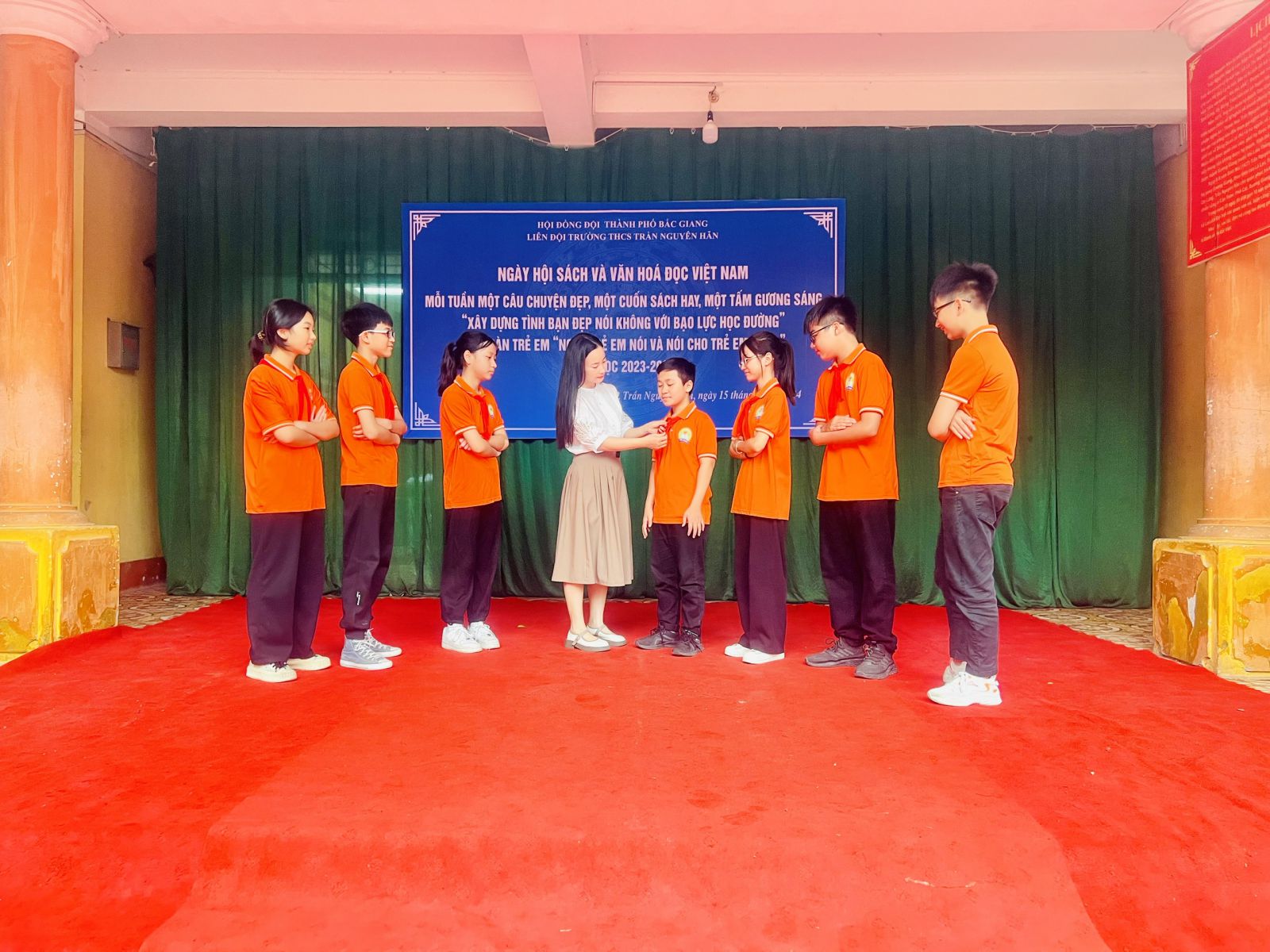 Thực hiện chương trình công tác Đội và phong trào thiếu nhi năm học 2023-2024 của Hội đồng Đội và Phòng GD&ĐT Thành phố Bắc Giang, sáng ngày 15/4/2024 Liên đội trường THCS Trần Nguyên Hãn tổ chức Ngày hội Đọc sách và Văn hoá đọc Việt Nam, Mỗi tuần một câu chuyện đẹp, một cuốn sách hay, một tấm gương sáng với chủ đề “ Xây dựng tình bạn đẹp nói không với bạo lực học đường” và Diễn đàn trẻ em “ Nghe trẻ em nói và nói cho trẻ em nghe” năm học 2023 - 2024