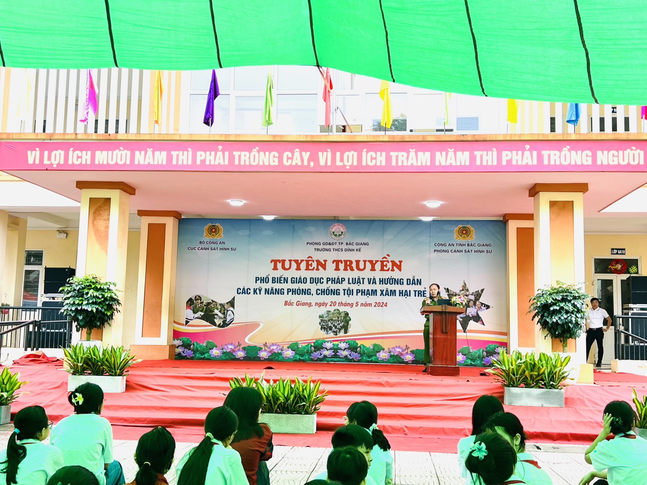 Thật vinh dự và tự hào, Sáng ngày 20/5/2024 Trường THCS Dĩnh Kế là nơi được chọn đặt địa điểm tuyên truyền với nội dung : ‘Tuyên truyền phổ biến giáo dục pháp luật và hướng dẫn các kỹ năng phòng, chống tội phạm xâm hại trẻ em’.