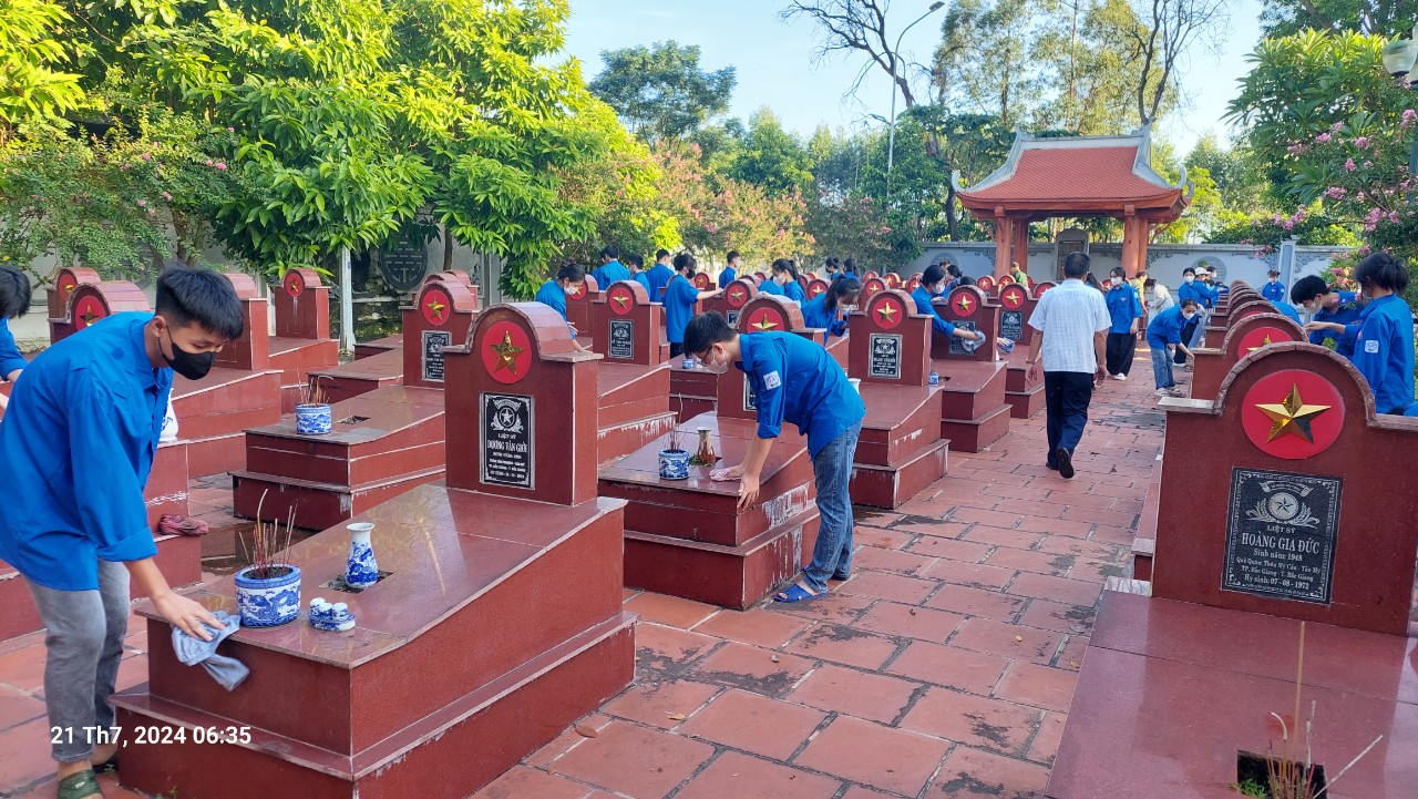 Sau khi dâng hương tưởng nhớ các anh hùng liệt sĩ, trên 200 đoàn viên thanh niên đã tiến hành cắm hồng kỳ; quét dọn, cắt tỉa cây xanh, nhổ cỏ, lau chùi và thực hiện vệ sinh môi trường trong toàn bộ khuôn viên Nghĩa trang liệt sĩ xã, góp phần làm nghĩa trang khang trang hơn, sạch đẹp hơn.