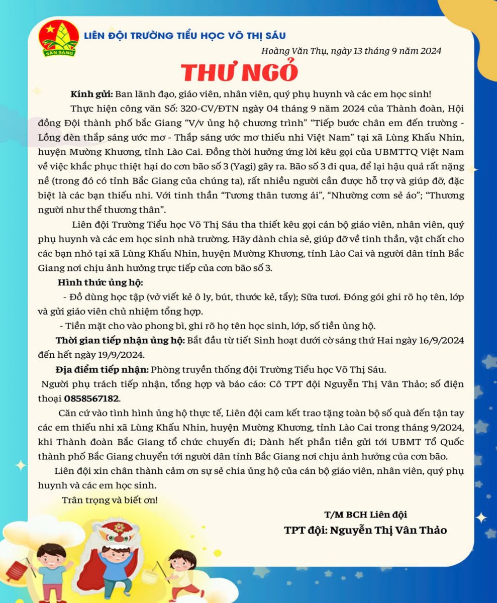 Thực hiện công văn Số: 320-CV/ĐTN ngày 04 tháng 9 năm 2024 của Thành đoàn, Hội đồng Đội thành phố bắc Giang “V/v ủng hộ chương trình “Tiếp bước chân em đến trường - Lồng đèn thắp sáng ước mơ - Thắp sáng ước mơ thiếu nhi Việt Nam” tại xã Lùng Khấu Nhin, huyện Mường Khương, tỉnh Lào Cai. Đồng thời hưởng ứng lời kêu gọi của UBMTTQ Việt Nam về việc khắc phục thiệt hại do cơn bão số 3 gây ra. Sau khi tuyền truyền đến học sinh về những thiệt hại to lớn của người dân và các bạn nhỏ vùng bị lũ, lụt phải hứng chịu. Sau khi đã tìm hiểu và lắng nghe tâm tư, nguyện vọng của các em học sinh và các bậc phụ huynh trong buổi họp phụ huynh ngày 13 tháng 9 năm 2024 về việc có nên tổ chức Tết Trung thu hay không và nhận được sự đồng thuận cao là không tổ chức.