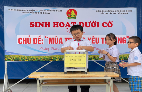 Hiệu trưởng Trường Tiểu học Võ Thị Sáu đã quyết định không tổ chức Tết Trung thu năm nay, dành toàn bộ số tiền dự tính tổ chức Tết Trung cho các em ủng hộ các bạn học sinh vùng lũ, lụt. Đồng thời được sự cho phép của lãnh đạo nhà trường. Thay mặt Ban chỉ huy Liên đội Trường Tiểu học Võ Thị Sáu đã gửi thư kêu gọi ủng hộ tới lãnh đạo, giáo viên, nhân viên, các bậc phụ huynh và các em học sinh trong nhà trường để chia sẻ và hỗ trợ động viên một phần nào đó đến nhân dân và các em học sinh ở các tỉnh thành phía Bắc bị ảnh hưởng nặng nề bởi cơn bão số 3 gây ra, trong đó có tỉnh Bắc Giang thân yêu của chúng ta. Mọi sự ủng hộ, chung tay góp sức dù lớn hay nhỏ đều sẽ làm vơi bớt những đau thương, mất mát của người dân và các em nhỏ nơi bị bão lũ, thiên tai.