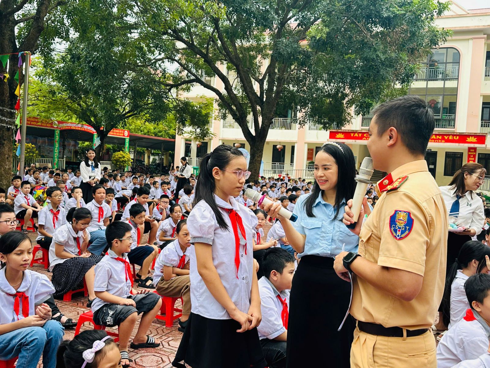 Buổi tuyên truyền diễn ra sôi nổi với sự tham gia của toàn thể giáo viên và học sinh nhà trường. Đại diện Công an Tỉnh Bắc Giang đã chia sẻ các thông tin thiết thực, gần gũi với lứa tuổi học sinh, giúp các em dễ dàng tiếp thu kiến thức quan trọng. Các nội dung tuyên truyền tập trung vào việc tuân thủ các quy định khi tham gia giao thông, cách nhận biết các biển báo giao thông cơ bản và quy tắc đi bộ an toàn. Ngoài ra, các em học sinh cũng được hướng dẫn cách ứng phó khi gặp tình huống bão lụt, bảo đảm an toàn cho bản thân và gia đình trong mùa mưa bão.