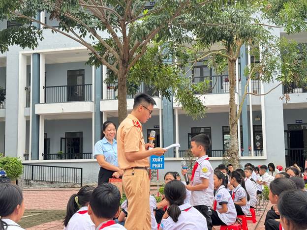Mở đầu chương trình, Đ/c Nguyễn Mạnh Hùng - Đại úy, cán bộ đội CSGT trật tự Công an thành phố Bắc Giang tuyên truyền và phổ biến pháp luật về ATGT cho các em học sinh. Thông qua cách đặt vấn đề gần gũi và các câu hỏi cụ thể, các em học sinh đã nắm được các kiến thức cơ bản về ATGT như: lứa tuổi quy định phải đội mũ bảo hiểm, cách đi ra khỏi cổng trường khi có đường một chiều, không điều khiển phương tiện giao thông khi đã uống rượu, bia...