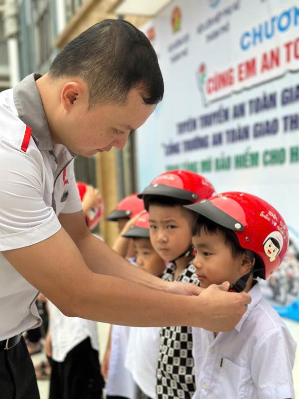 Tiếp theo, các em học sinh được làm quen với bài giảng “Đội mũ bảo hiểm đúng cách - Ngồi sau xe máy, xe đạp an toàn” do các hướng dẫn viên Lái xe an toàn của Hệ Thống Honda Trường An – Xe Máy Long Hưng thực hiện.