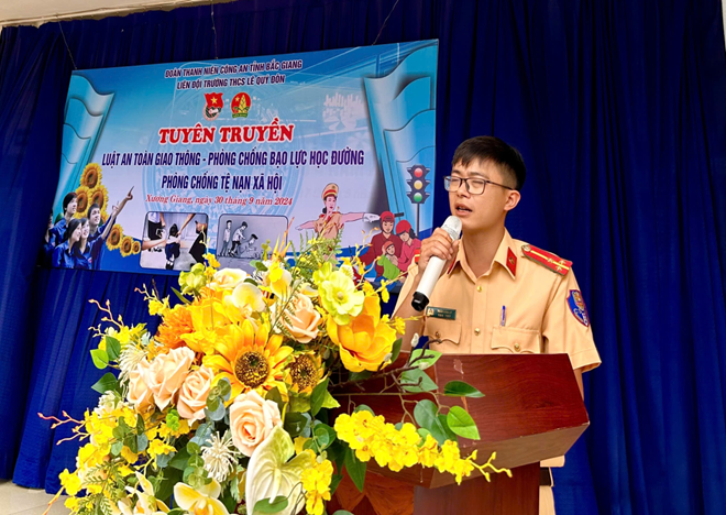 Tại buổi tuyên truyền, đồng chí đại úy Ong Xuân Mạnh-Phó bí thư chi đoàn Phòng cảnh sát hình sự thông tin đến các em học sinh về việc phòng chống bạo lực học đường và cách phòng chống bạo lực học đường. Học sinh nắm được thế nào là bạo lực học đường; các loại bạo lực như bạo lực thân thể, bạo lực tinh thần; các nguyên nhân gây ra bạo lực học đường. Đồng chí Mạnh đã gợi ý các cách phòng chống; ngăn chặn bạo lực học đường. Lồng ghép trong chương trình tuyên truyền, đồng chí cũng đã khéo léo giúp học sinh hiểu được thế nào là tệ nạn xã hội và cách tránh xa các tệ nạn xã hội.