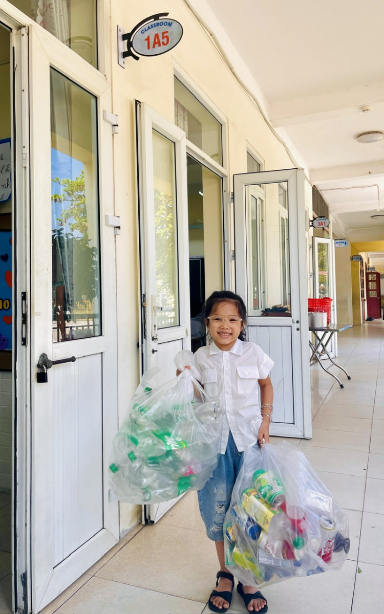 Bạn Phạm Quỳnh Anh học sinh lớp 1A5 vui mừng chia sẻ: Khi cô giáo phát động con đã về nhà bảo ông bà bố mẹ cùng thu gom giấy, bìa cũ, vỏ lon, vỏ chai không vứt đi mà giữ lại để làm kế hoạch nhỏ và đổi cây xanh cho lớp. Con rất vui vì con đã thu gom được rất nhiều vỏ lon và vỏ chai nhựa. Lớp con đã đổi được một chậu cây rất đẹp ạ”.