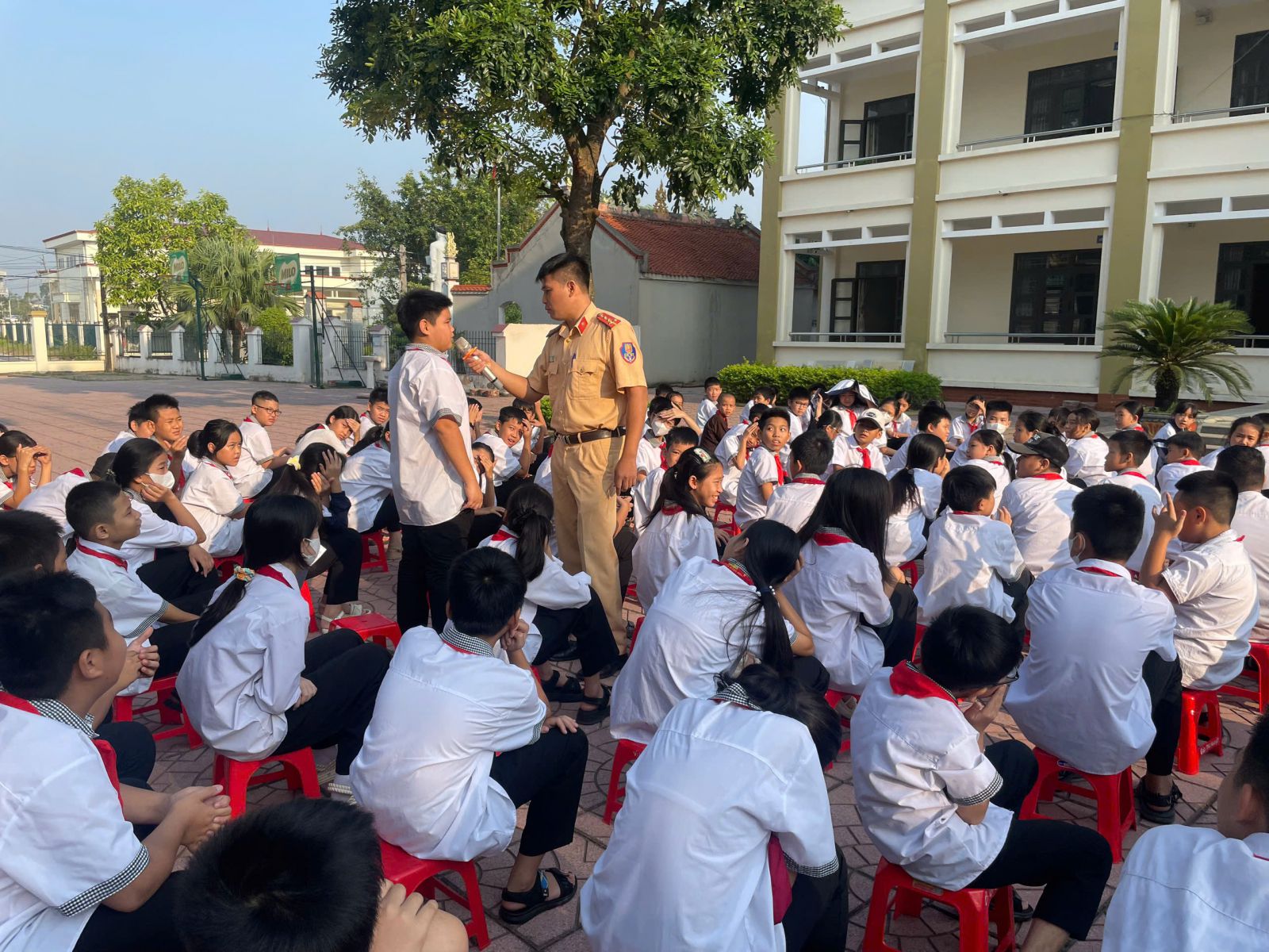 Đồng chí Đại úy Trần Văn Hùng đã giao lưu, chia sẻ, phân tích rõ những tình huống phổ biến có thể dẫn đến tai nạn như rẽ từ trong ngõ ra đường chính không quan sát, không nhường đường, không làm chủ tốc độ hay chuyển hướng, chuyển làn không đúng vạch kẽ đường… đồng thời cung cấp cho học sinh những kiến thức cơ bản về Luật Giao thông đường bộ, giúp các em nâng cao ý thức chấp hành pháp luật. Mỗi học sinh sẽ là một tuyên truyền viên tích cực nhắc nhở người thân trong gia đình, tham gia giao thông đúng quy định, phòng ngừa tai nạn giao thông.